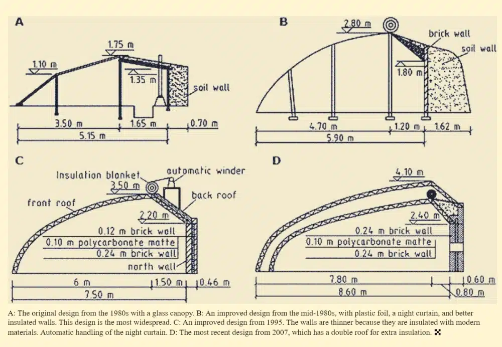 특수한 형태의 온실로는 중국식 태양열 온실이 있다. 이는 1978년 처음 등장했으며, 태양 에너지를 최대한 활용하도록 설계되어 별도의 난방 없이도 추운 기후에서 높은 효율을 보인다. 주로 3면을 벽돌이나 흙으로 두껍게 쌓아 단열 효과를 높이고, 남쪽 면만 투명하게 만들어 낮 동안 열을 저장한다. 이 구조 덕분에 겨울철에도 온실 내부 온도를 바깥보다 최대 25°C 더 따뜻하게 유지할 수 있다.[43] 현대에는 단열재나 자동 개폐식 보온 커튼 등을 도입하여 효율을 더욱 높이고 있다. 중국식 태양열 온실은 비교적 단순하고 비용 효율적이지만, 햇빛을 최대한 받기 위한 방향 설정이 중요하고 플라스틱 필름의 내구성 문제가 단점으로 지적되기도 한다.[44] 그럼에도 불구하고 일교차가 큰 지역에서 연중 농사를 가능하게 하는 실용적인 방식으로 평가받으며, 특히 중국 북부 지역에서 널리 활용되고 있다.