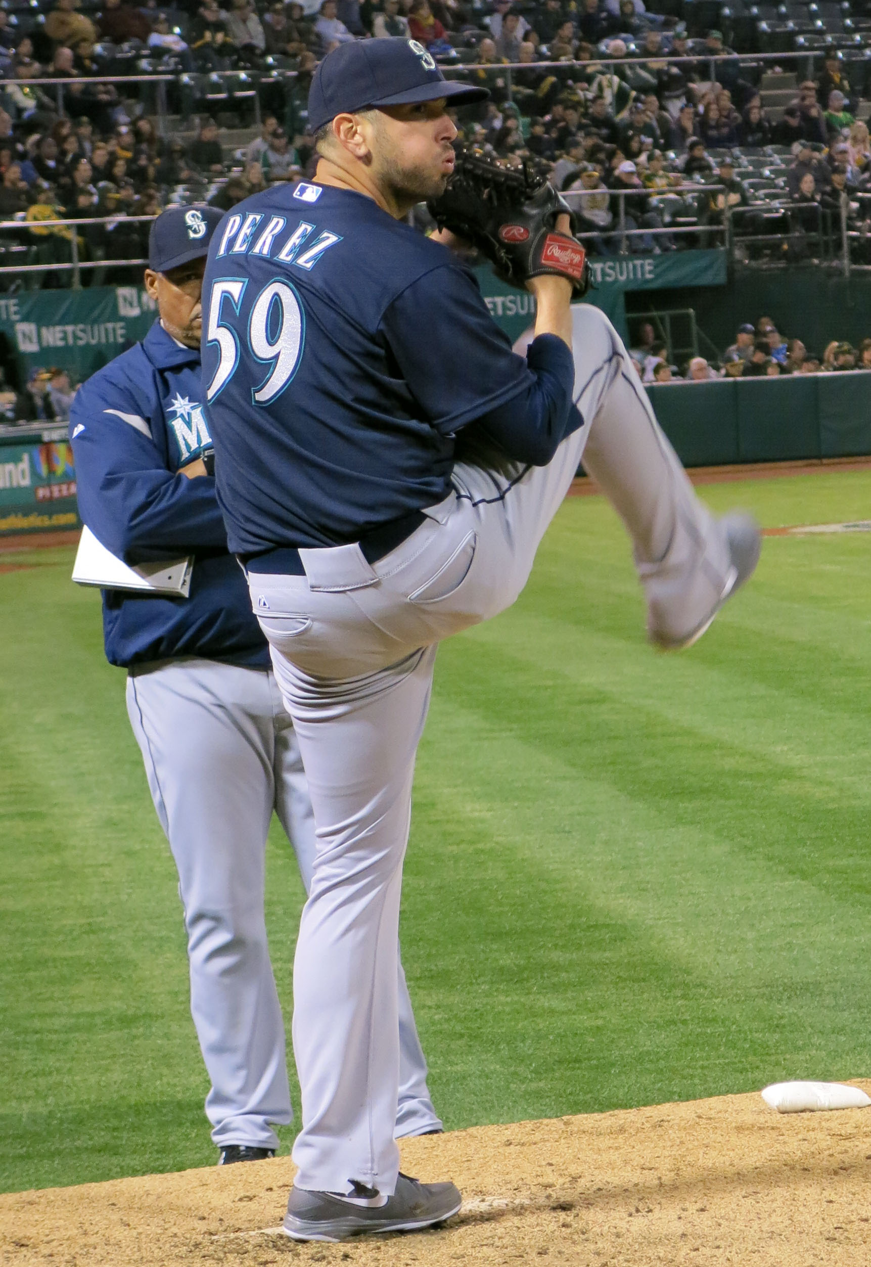 2012년 1월 19일, 시애틀 매리너스는 페레스와 스프링 트레이닝 초청을 포함한 마이너 리그 계약을 체결했다. 이 계약에는 페레스가 매리너스 25인 로스터에 포함될 경우 750000USD의 보너스와 250000USD의 성과 인센티브가 포함되어 있었다.[18] 페레스는 퍼시픽 코스트 리그의 클래스 AAA 팀인 타코마 레이니어스에서 22번의 구원 등판을 기록했고,[17] 2승 2패, 평균자책점 4.65를 기록했으며, 6월 16일 구원 투수로 메이저 리그 팀에 합류했다.[19] 2010년 이후 메이저 리그에 복귀한 첫 달에 관찰자들은 그의 향상된 패스트볼 구속과 삼진 대 볼넷 비율에 주목했다.[20] 페레스는 33경기에서 29.2이닝을 소화하며 1승 3패, 평균자책점 2.12를 기록했다.