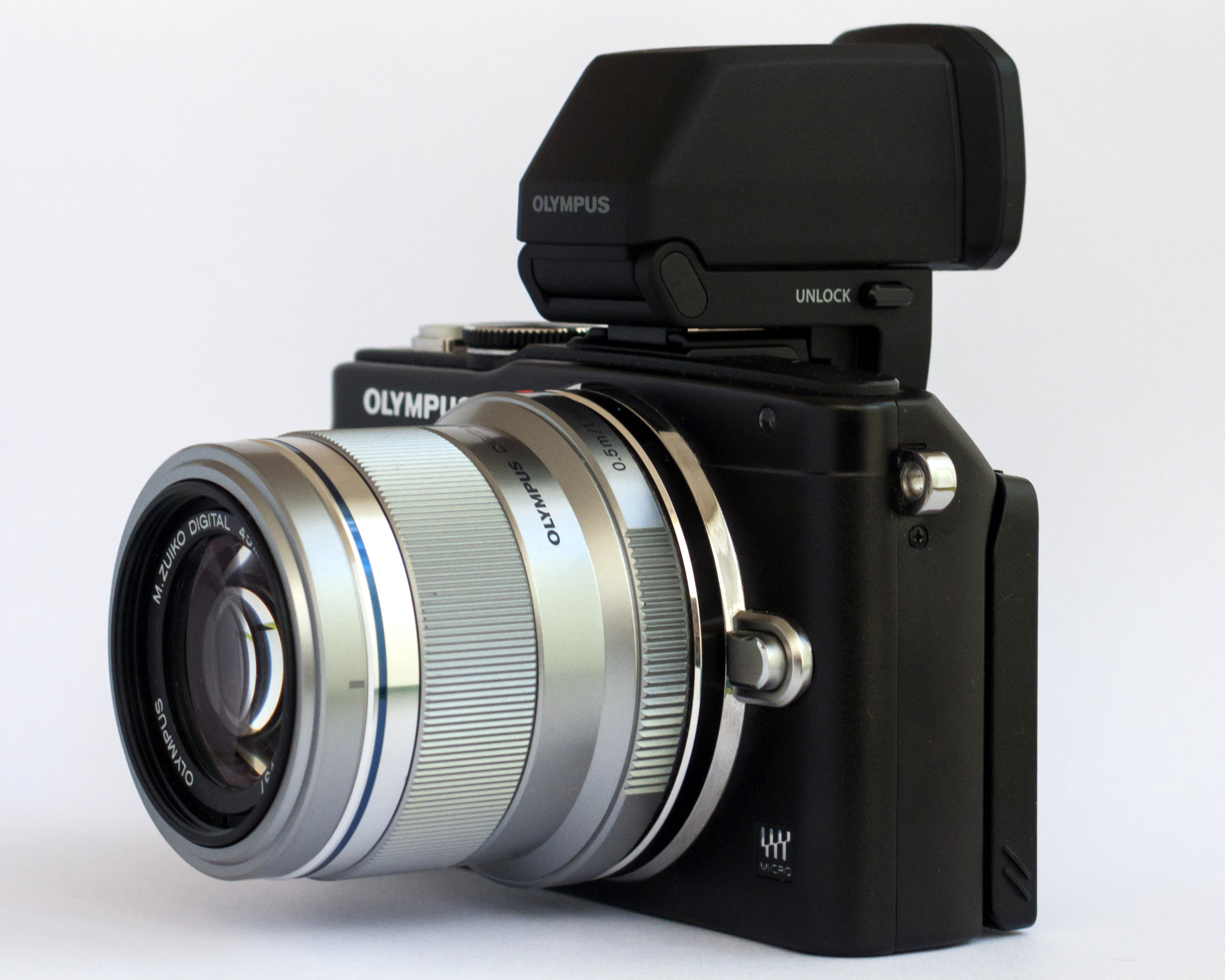 VF-4 뷰파인더와 올림푸스 M.Zuiko Digital ED 45mm f/1.8 렌즈를 장착한 E-PL5