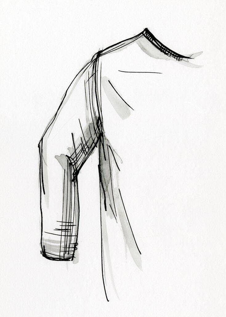 콜드 숄더 소매어깨 위쪽의 스티치 부분을 넘어 연결이 끊어진 긴 소매. 겨드랑이가 있는 아래쪽은 연결되어 있다. 상완 이두근 부분이 노출된다.