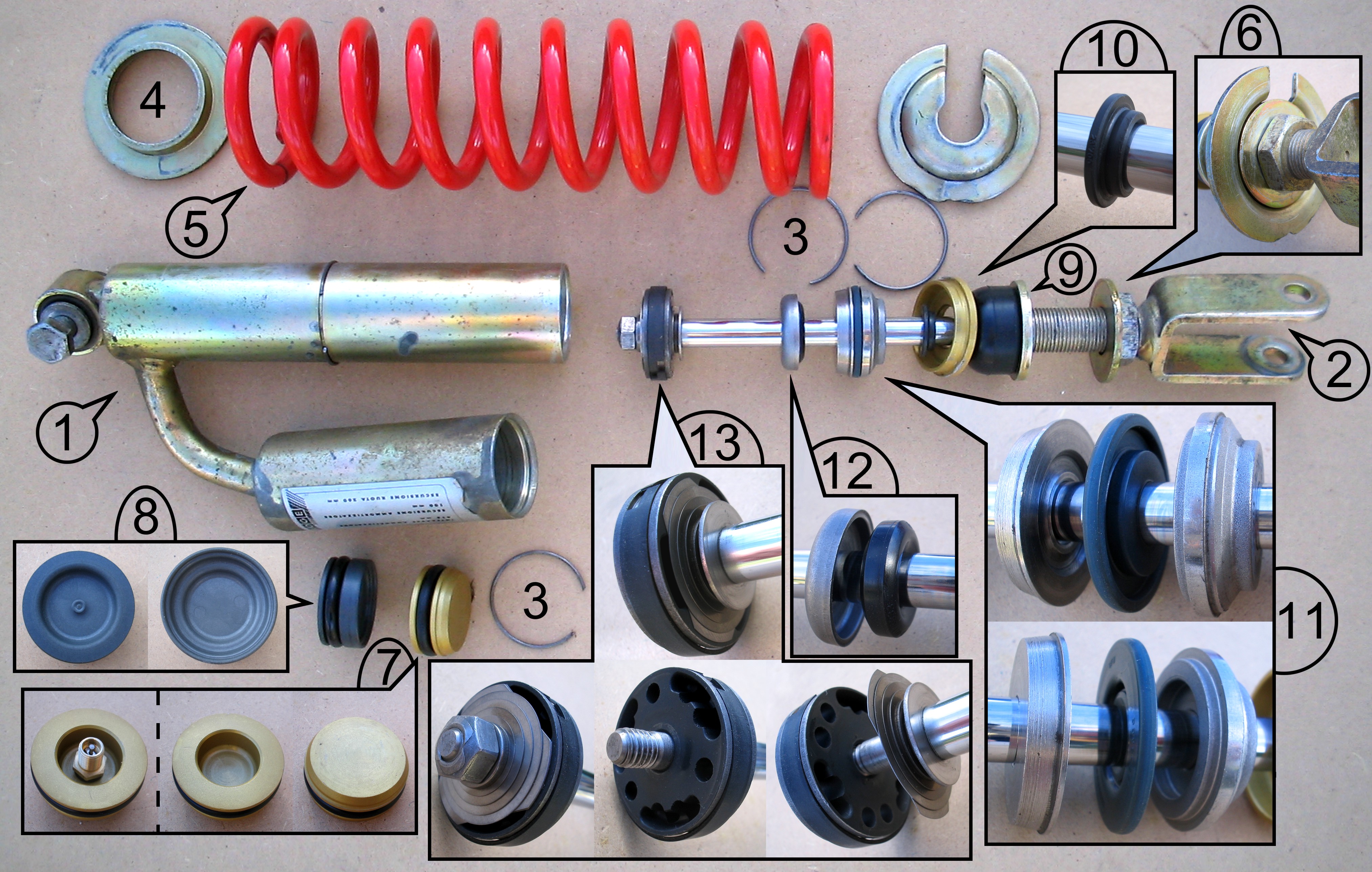 자동차 서스펜션의 문제 중 하나는, 특히 뒷바퀴 쪽 스프링의 경우, 짐을 적게 실었을 때와 가득 실었을 때의 하중 차이가 크다는 점이었다. 짐이 무거울 때는 스프링이 바닥에 닿는 것을 막기 위해 고무 '범프 스톱'을 장착하기도 했고, 가볍게 실었을 때 승차감을 부드럽게 하기 위해 무거운 주 스프링에 보조 스프링을 추가하는 시도도 있었다. 이를 종종 '충격 흡수 장치'라고 불렀다. 스프링과 차체가 결합되어 특정 주파수로 계속 튀는 현상(주기 진동)이 발생한다는 것이 알려지면서, 보조 스프링을 주 스프링과 다른 주기를 갖도록 설계하기도 했지만, 울퉁불퉁한 길을 지난 후 스프링이 반동하며 사람이 좌석에서 튕겨 나가는 근본적인 문제를 해결하지는 못했다. 필요한 것은 스프링이 원래 상태로 돌아가려는 반동을 억제하는 감쇠였다.