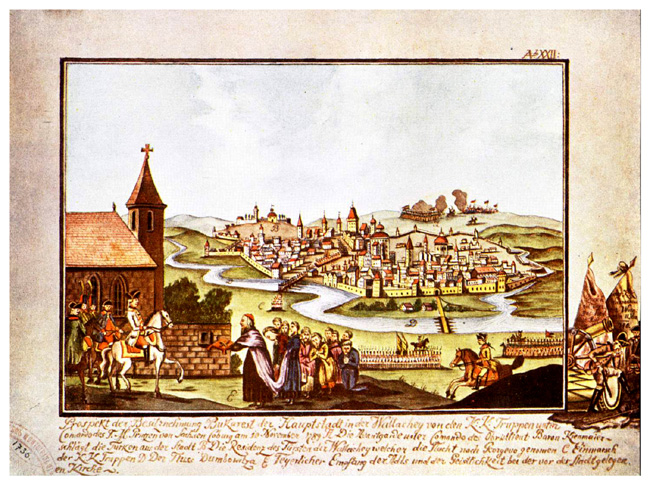 코부르크 공 요시아스 휘하의 합스부르크 군대는 러시아-튀르크-오스트리아 전쟁 동안 다시 왈라키아에 진입하여 1789년 니콜라스 마브로게네스를 폐위시켰다.[72] 오스만 제국의 회복 이후 위기의 시기가 뒤따랐다: 올테니아는 강력한 반란 파샤인 오스만 파즈반토글루의 원정에 의해 황폐화되었고, 그의 습격은 심지어 콘스탄틴 항게를리 공자가 반역 혐의 (1799)로 목숨을 잃게 했고, 알렉산더 무루시스는 그의 왕위를 포기하게 만들었다 (1801).[73] 1806년, 1806-12년 러시아-튀르크 전쟁은 부분적으로 부쿠레슈티에서 콘스탄틴 입실란티스를 폐위시킨 술탄의 관청에 의해 촉발되었다. 이는 나폴레옹 전쟁과 일치하며, 퀴취크 카이나르자 조약의 영향 (다뉴브 공국에서 러시아의 정치적 영향력에 대한 허용적 태도)을 보여주었다. 전쟁은 미하일 안드레예비치 밀로라도비치의 침략을 초래했다.[74] 부쿠레슈티 평화 조약 이후, 장 조르주 카라자의 통치는 주요 역병 유행으로 기억되지만, 문화 및 산업 벤처로 유명했다.[75] 이 기간 동안 왈라키아는 러시아의 확장을 감시하는 데 관심이 있는 대부분의 유럽 국가들에게 전략적 중요성을 높였다. 부쿠레슈티에 영사관이 개설되었으며, 이는 ''수디티'' 상인 (곧 지역 길드와 성공적으로 경쟁함)에게 제공한 보호를 통해 왈라키아 경제에 간접적으로, 그러나 큰 영향을 미쳤다.[76]