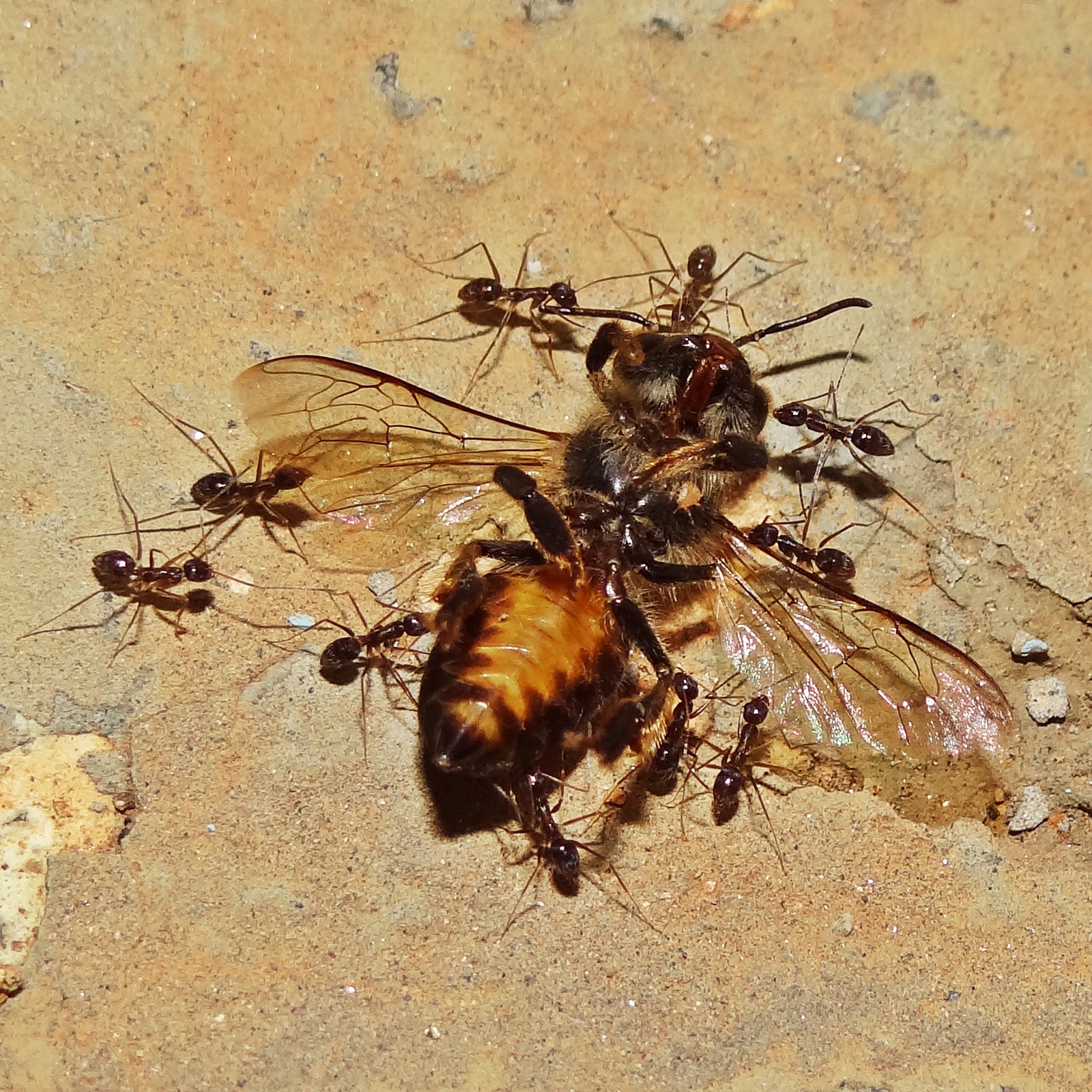 일개미가 먹이를 발견하면, 그 정보를 둥지의 다른 구성원들에게 전달한다. 이들은 생화학 물질인 페로몬을 사용하여 둥지에서 먹이가 있는 곳까지 가장 짧은 경로를 표시한다. 많은 수의 일개미가 이 경로를 따라 이동하면 페로몬 신호의 강도가 높아져 먹이 탐색 경로가 확립된다. 먹이가 다 떨어지면 이 경로는 사라진다. 일개미들은 자신이 찾은 먹이를 먹은 뒤, 둥지로 돌아와 토해내는 방식으로 여왕과 애벌레에게 먹이를 공급한다. 이러한 먹이 탐색 경로는 땅속이나 지상에 만들어질 수 있다.[14]