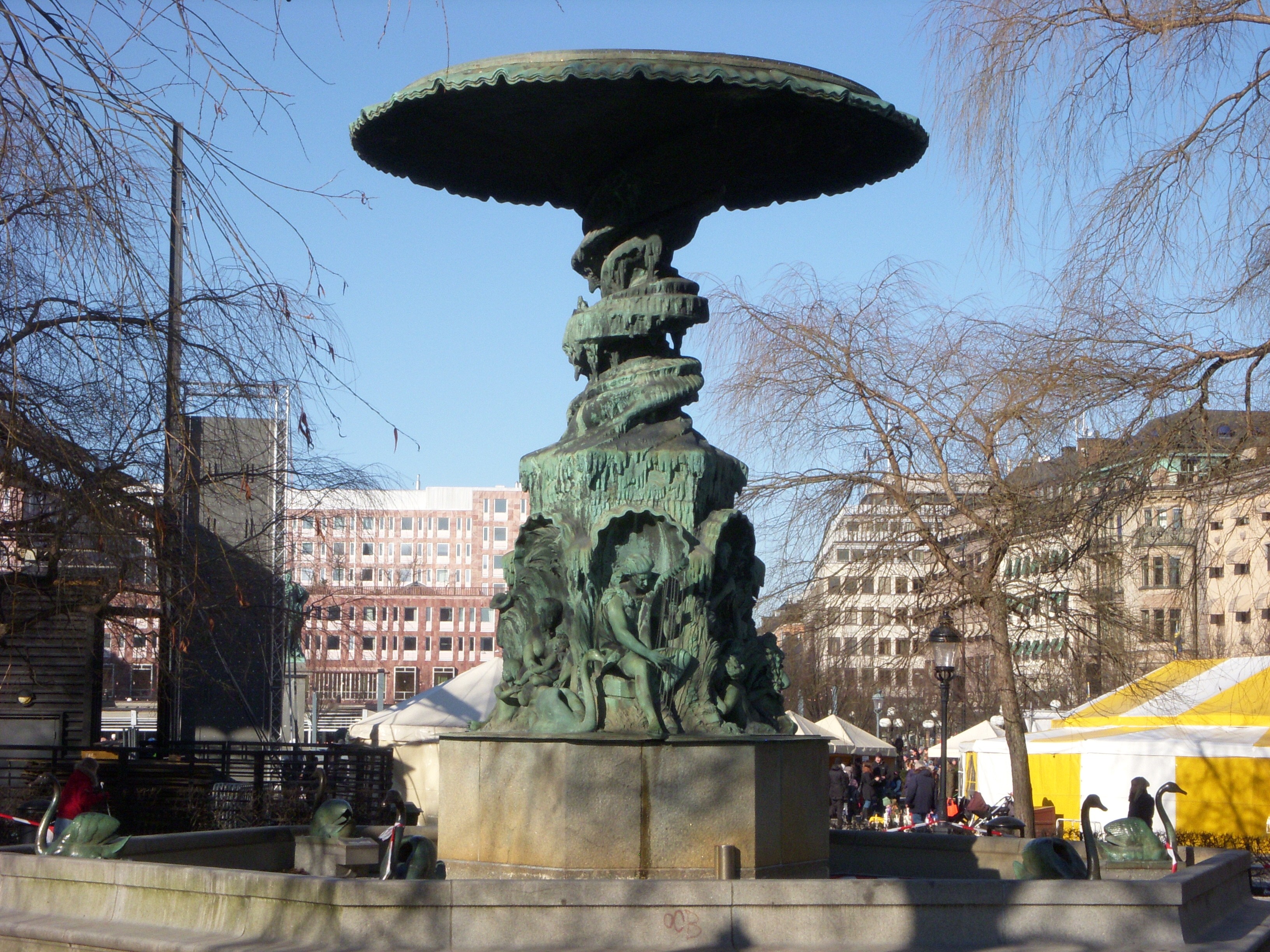 요한 페테르 몰린이 디자인한 이 분수는 원래 석고로 만들어져 1866년 스칸디나비아 스톡홀름 예술 및 산업 박람회의 중심 장식물로 설치되었다. 당시 박람회 건물은 큰 규모에도 불구하고 관람객 유치에 어려움을 겪었지만, 분수 자체는 큰 호응을 얻었다. 이에 시민들의 기부금을 모아 청동으로 다시 제작되었고, 1873년 원래 위치에 세워졌다.[16]