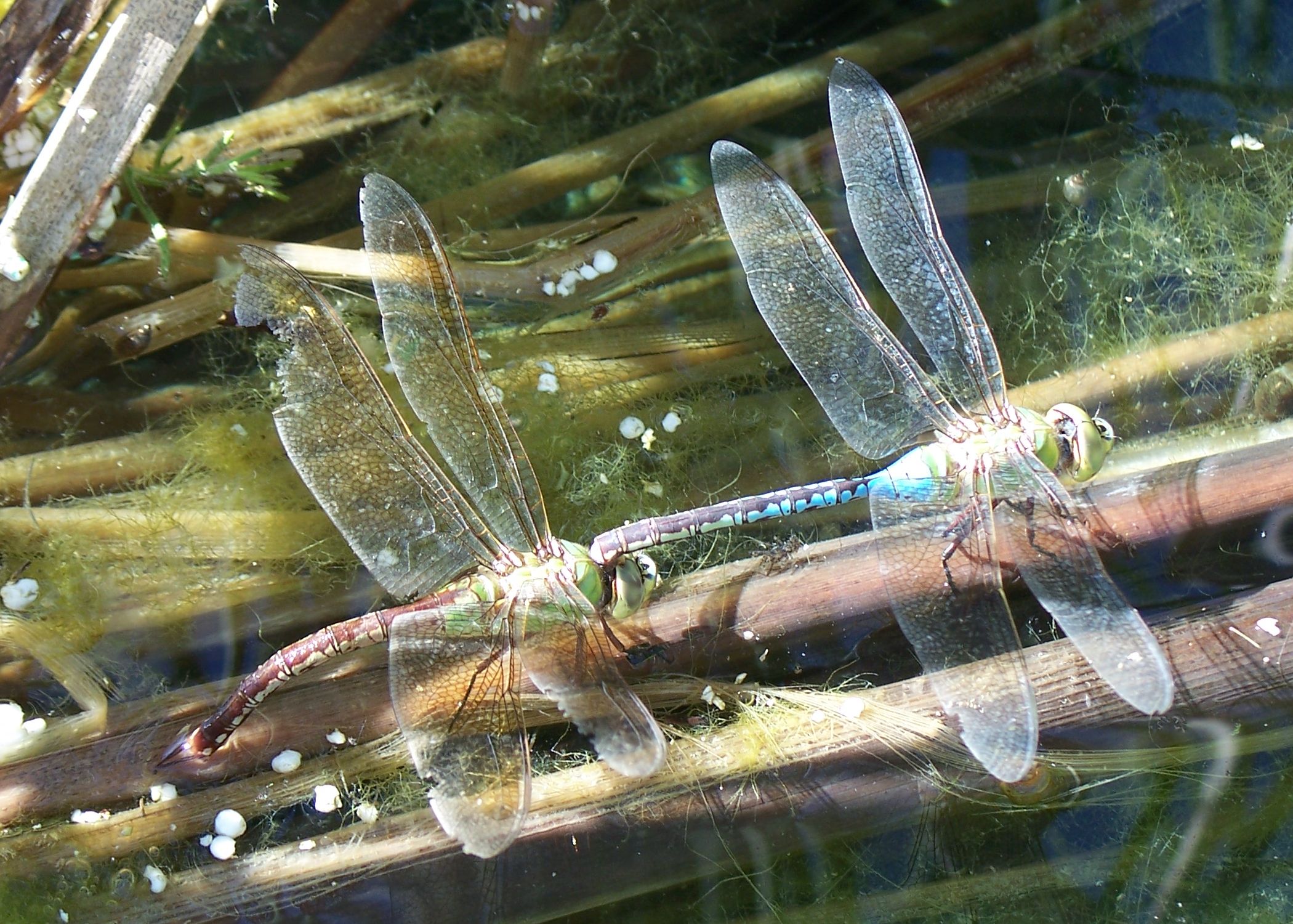 성충은 교미 후에 수컷과 암컷이 서로 연결된 상태로 산란하는 것이 일반적이다. 이러한 행동은 유럽의 다른 잠자리류 중에서는 ''Aeshna affinis''와 유럽으로 이주하는 두 종인 ''Anax ephippiger'' 및 ''Anax junius''에서만 관찰된다. 때로는 암컷이 단독으로 수면 위로 솟아 있는 수초 등에 앉아 배 끝에 있는 산란관을 식물 조직이나 진흙 속에 꽂아 알을 하나씩 낳기도 한다.