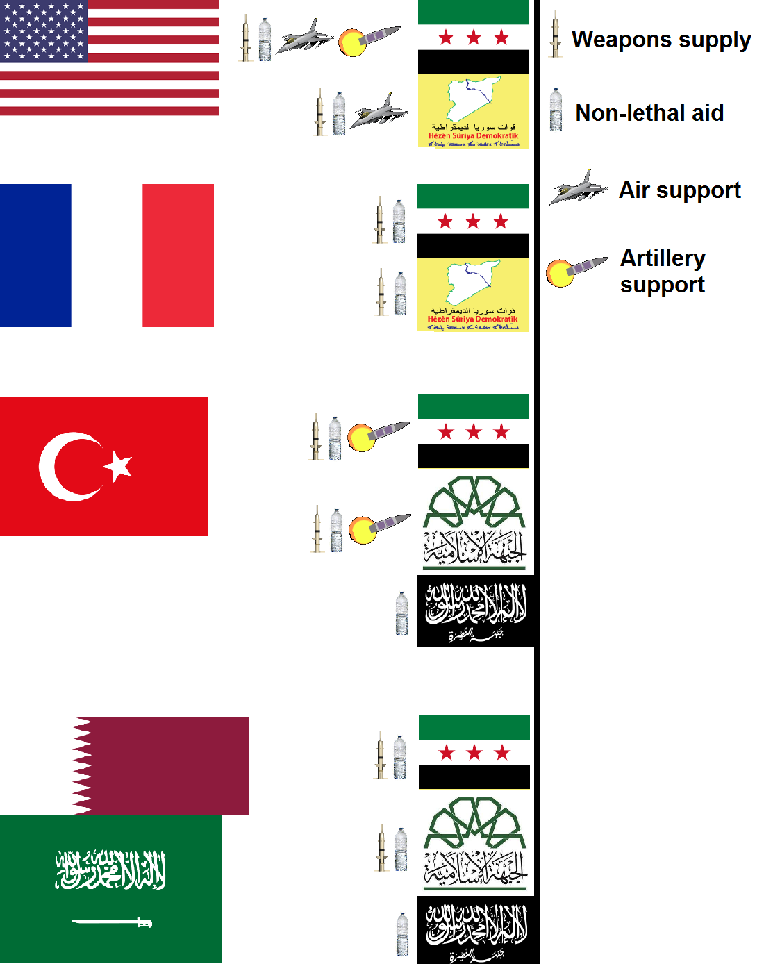 - 반군 지원 세력: 터키, 사우디아라비아, 카타르, 프랑스 등은 재정 지원, 무기 제공, 군사 훈련 등 다양한 방식으로 시리아 반군을 돕는다.