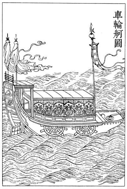 > "...1132년에서 1183년 사이에 크고 작은 수많은 발판식 외륜선이 건조되었으며, 여기에는 선미 외륜선과 측면에 11개의 외륜이 달린 선박도 포함되었다."[23]