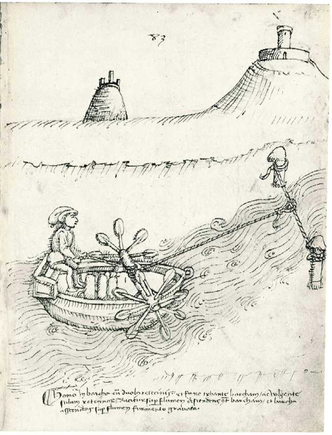 외륜선, 이탈리아 예술가-엔지니어 타콜라의 작품, ''De machinis'' (1449): 외륜은 닻에 고정된 로프를 감아 강물을 거슬러 배를 이동시킨다.