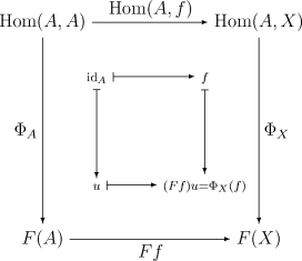 관수 가 공변()이라고 하자. 이때, 공변 hom 관수 에서 로의 자연 변환 는 임의의 의 사상 에 대해 가 정의로부터 성립한다. 이제, 의 경우에, 에서의 항등 사상 가 어떻게 사상되는지를 추적함으로써, 등식