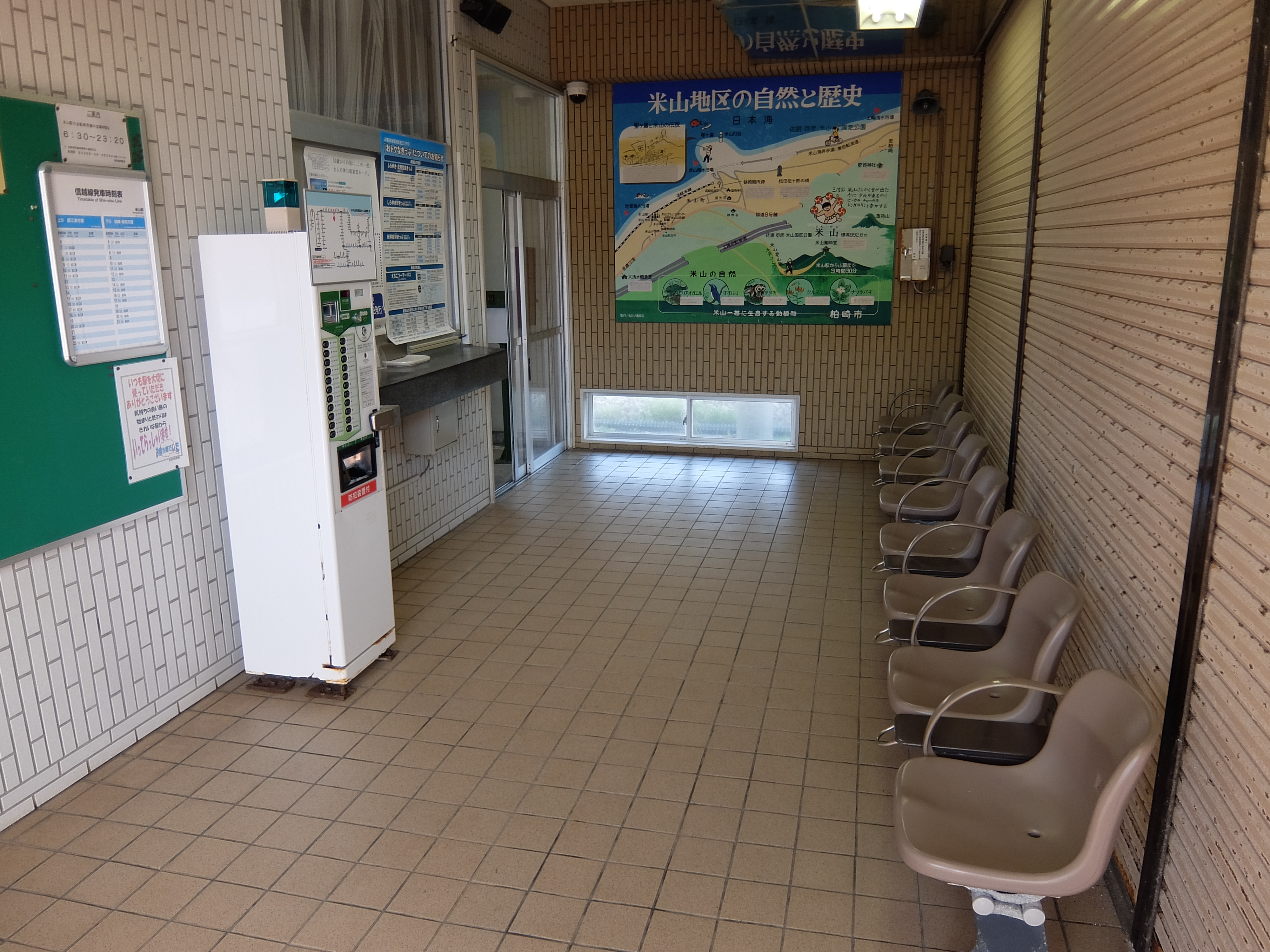 현재 역사는 1986년 가을 국철 가시와자키역, 요네야마 지구 농업협동조합 (현 JA 에치고 주고에츠)과의 합축으로 완성되었으며, 진료소가 입점해 있었다.[1] 역사 내에는 대합실, 승차역 증명서 발행기, 운행 정보 표시기가 있었다. 화장실은 역사 밖 서쪽에 있었다.[4] 2002년 JA 가시와자키 요네야마 지소 폐지 후[1] 완전 무인화되었고, 농협 ATM도 2010년대에 철거되었다.