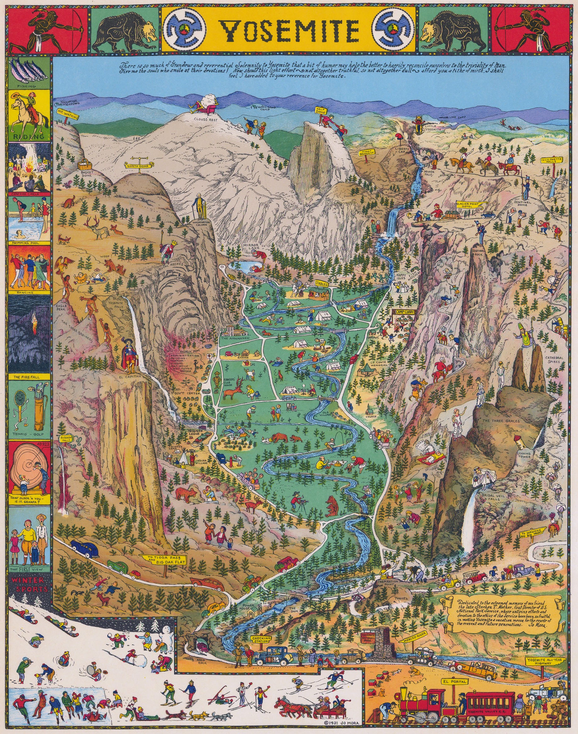 1855년, 제임스 허칭스는 최초의 관광객 일행을 조직하여 요세미티 계곡으로 데려왔고, 예술가 토마스 에어스는 요세미티에 대한 초기 홍보 자료를 많이 만들어냈다. 에어스의 매우 상세하고 각진 과장된 작품과 그의 기록은 전국적으로 배포되었으며, 뉴욕시에서 그의 그림 전시회가 열렸다. 허칭스의 첫 번째 관광객 그룹 중 두 명인 밀턴과 휴스턴 만은 계곡으로 가는 최초의 통행료 도로를 건설했고, 이 지역에 최초의 호텔을 건설했다.