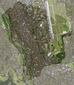 후사시 시역의 위성 사진. 오른쪽이 요코타 기지. 왼쪽이 다마가와. 하부 왼쪽에서 합류하는 곳이 아키가와.
