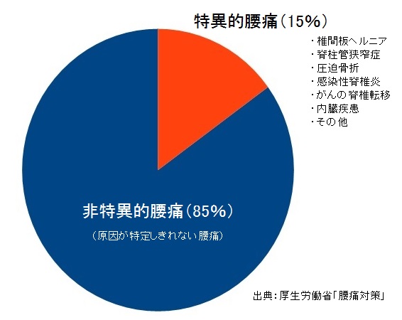 요통 중 골절, 감염증, 암, 변성 질환 등 원인이 명확하게 밝혀진 경우를 특이적 요통이라고 한다. 이는 전체 요통의 약 15% 정도를 차지한다[145][145]. 나머지 85%는 원인이 뚜렷하지 않은 비특이적 요통이다. 특이적 요통은 영상 검사 등에서 발견된 이상 소견이 요통의 직접적인 원인일 가능성이 있지만, 영상 소견과 실제 통증이 항상 일치하는 것은 아니므로 진단에 주의가 필요하다[147]. 때로는 통증의 원인이 허리 자체의 문제가 아니라, 허리 주변에 위치한 소화기나 비뇨기 계통 장기의 질병일 수도 있다[146].
