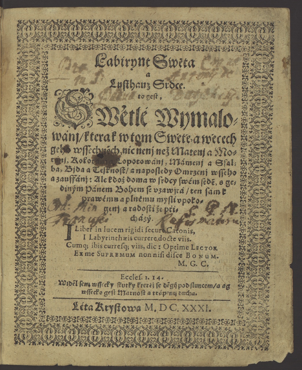 요한 아모스 코메니우스는 체코 개혁가 얀 후스의 가르침을 따르는 형제 연합 교회의 주교였다.[15] 그의 대표적인 신학 저서 중 하나는 ''세상의 미궁과 마음의 낙원''이다. 이 책에서 코메니우스는 세상이 헛된 것들과 복잡한 미궁으로 가득 차 있으며, 진정한 마음의 평화와 영혼은 오직 구세주 그리스도가 거하고 통치하는 자신의 마음속에서만 찾을 수 있다고 보았다. 이러한 가르침은 그의 마지막 저서 중 하나인 ''Unum Necessarium''(오직 하나만 필요함)에서도 반복되는데, 여기에서 그는 세상의 다양한 미궁과 문제점을 보여주고 다양한 상황에 대한 간단한 해결책을 제시한다. 이 책에서 그는 또한 예언과 당시의 계시를 믿었던 것이[15] 여러 번 길을 잃었던 개인적인 미궁이었음을 고백한다. 그는 뵈메의 영향을 크게 받았다.