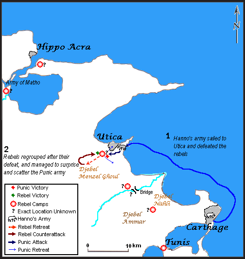 기원전 240년 초, 한노는 100마리의 코끼리와 공성 병기를 갖춘 군대를 이끌고 우티카를 구원하기 위해 출진했다.[46][47] 우티카 전투에서 반란군의 야영지를 기습 공격하여 포위망을 뚫었지만, 전투 경험이 풍부한 시칠리아 주둔군 베테랑들이 반격하여 카르타고 군은 많은 병력을 잃고 군수품과 공성 병기를 빼앗긴 채 도망쳤다.[30][48] 그 후 한노는 반란군과 산발적인 교전을 벌였지만, 전장 지휘관으로서의 무능함을 드러냈다.[30][48]