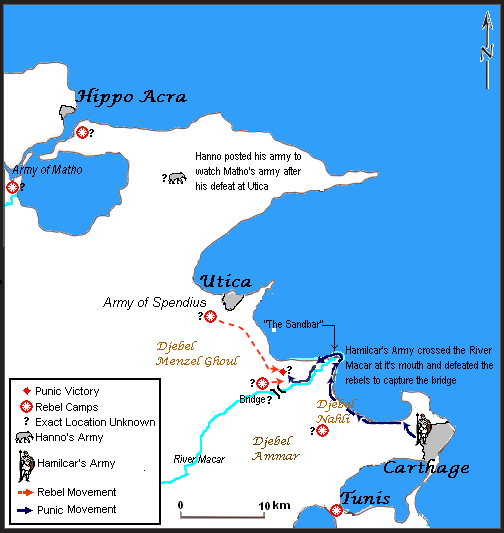 우티카 남서쪽 산악 지대에서 하밀카르는 반란군과 전투를 벌이려다 포위당했지만, 시칠리아에서 하밀카르를 섬기며 그를 존경했던 누미디아 지도자 Naravas|나라바스영어가 기병 2,000명을 이끌고 투항하여 위기에서 벗어났다.[59][60] 이어진 전투에서 카르타고 군은 10,000명을 죽이고 4,000명을 포로로 잡는 대승을 거두었다.[61]