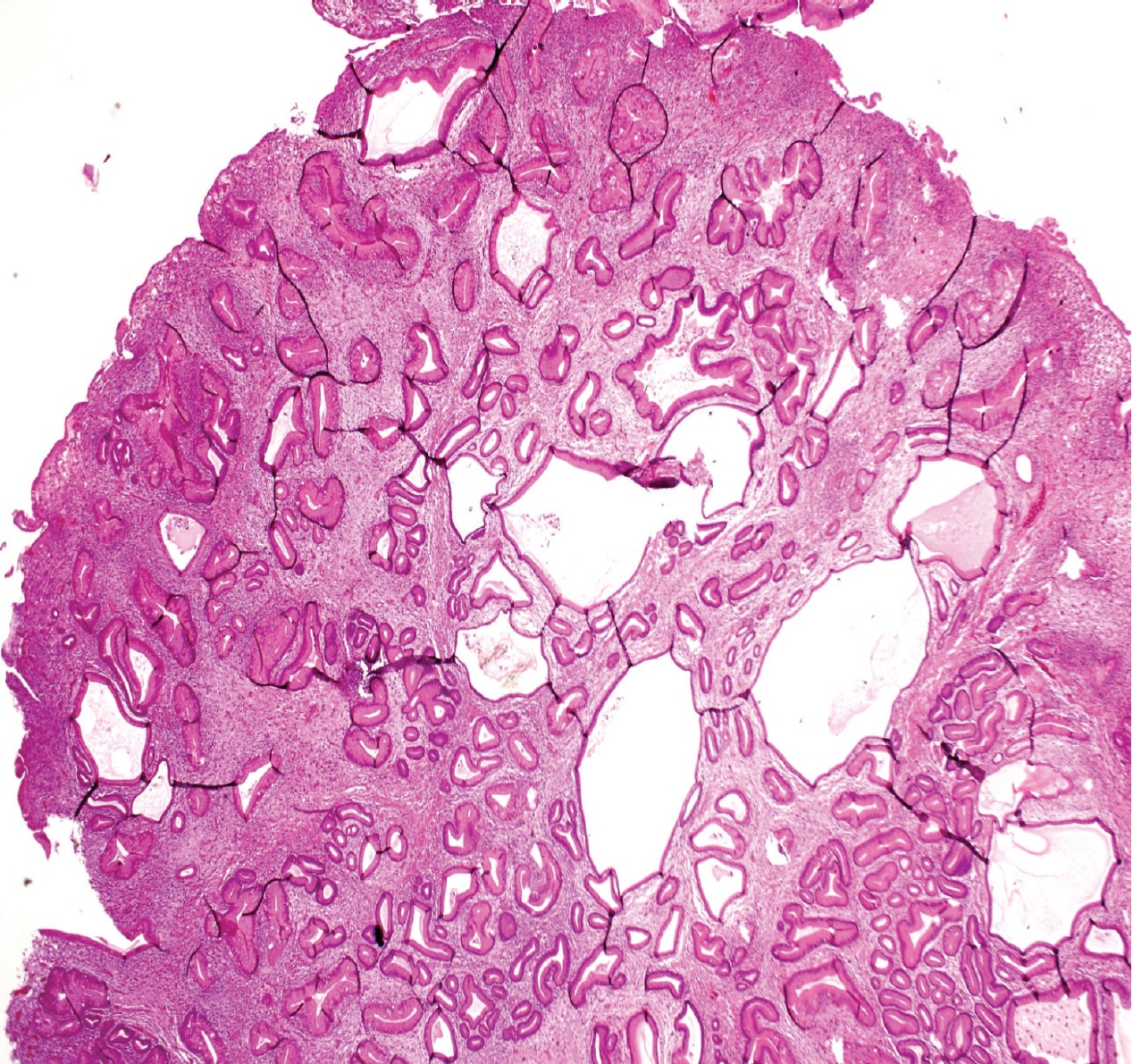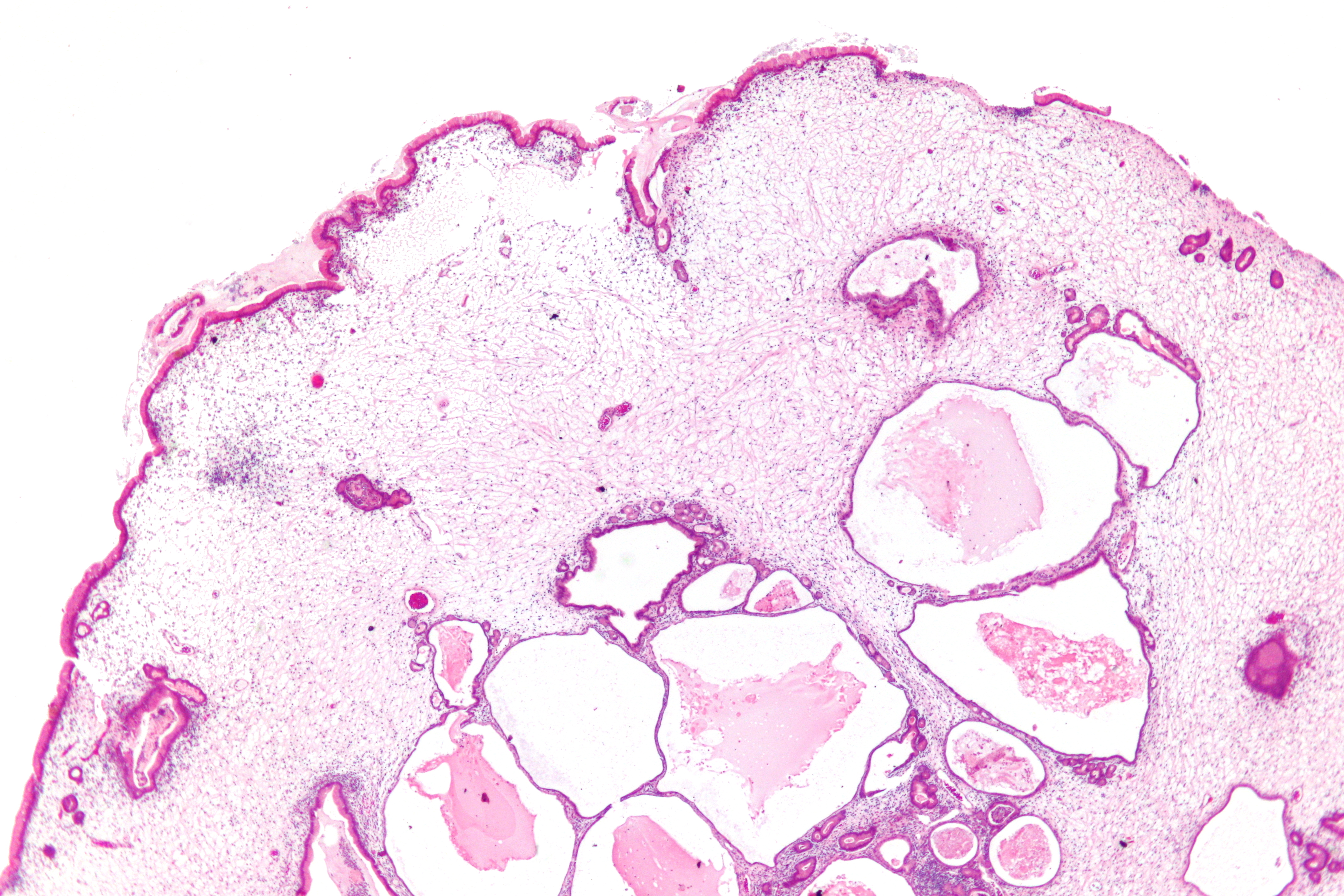 위 과형성 용종 | 위 | 부종성 및 염증성 기질로 분리된 신장되고 뒤틀린 낭포성 와상 | 위 과형성 용종증 | ||