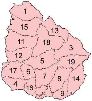 (빌라 데 과달루페로 설립)4536km2 520,187 114.68 카넬로네스 19,865 세로라르고 UY-CL 1821년 13648km2 84,698 6.21 멜로 53,245 콜로니아 UY-CO 1816년 6106km2 123,203 20.18 콜로니아델사크라멘토 26,231 두라즈노 UY-DU 1822년