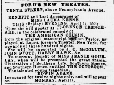 유명한 공연 | 1865년 4월 14일 (포드 극장) |