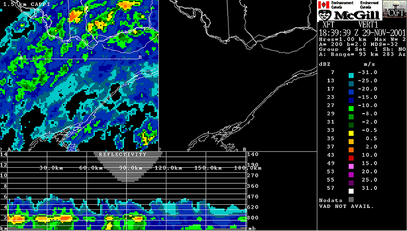 밝은 띠의 존재는 눈이 녹을 수 있는, 지상 위의 따뜻한 층이 존재함을 의미한다. 이는 지상에서 비를 내리게 하거나, 기온이 영하로 떨어질 경우 어는 비가 내릴 가능성을 높인다. 첨부된 이미지는 레이더 데이터를 통한 단면에서 이러한 인공물이 어떻게 위치하는지 보여준다.[8][9] 밝은 띠의 높이와 기울기는 눈이 녹는 지역의 범위를 파악하는 단서가 된다. 이 단서를 지상 관측 및 수치 예측 모델과 연관시키면, 레이더 에코가 비, 혼합형, 눈 강수로 뚜렷하게 표시되는 텔레비전 기상 프로그램에서 볼 수 있는 것과 같은 결과를 생성할 수 있다.