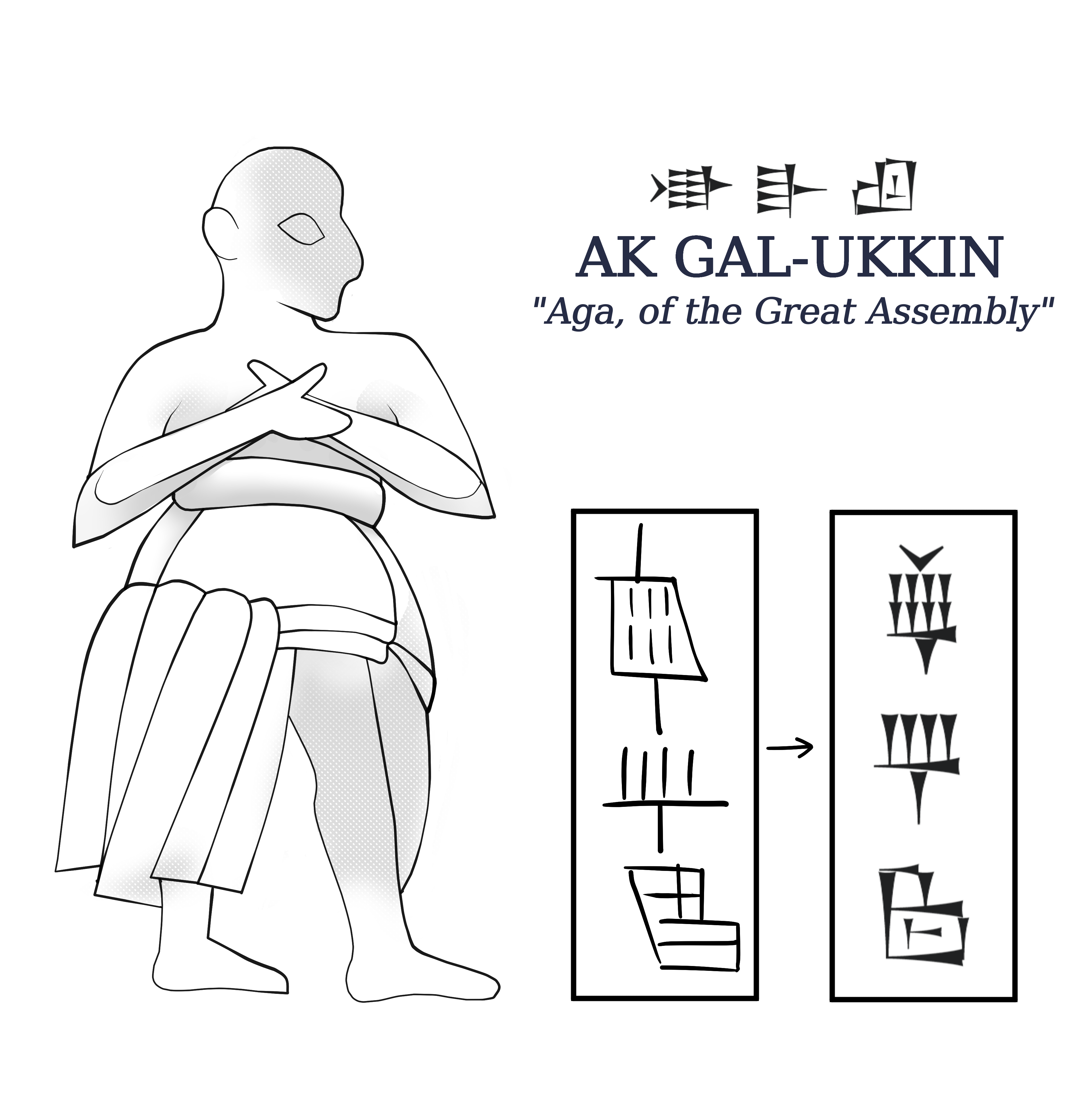 우슘갈 석비에 "아카"(Akka)라는 이름이 새겨져 있다는 점은 주목할 만하다. 특히 '아크 갈-우킨'(Ak gal-Ukkin)이라는 글귀가 있는데, 여기서 우킨은 수메르 의회로 해석된다. 따라서 '대의회의 아카'로 읽혀질 수 있으며, 키시의 국왕 아가를 가리키는 것이라는 견해가 있다.[19][20]3. 갤러리