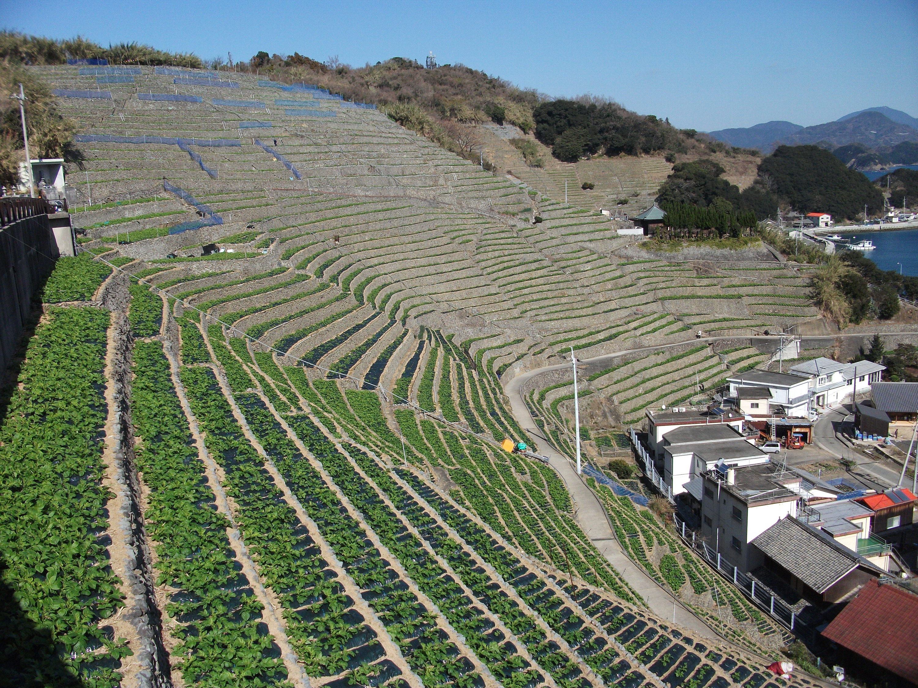 실제로는 하치만하마시보다 남남동쪽에 위치하지만, JR 시코쿠 요산선 특급 열차의 종착역이기 때문에, 현지 주민 이외에는 에히메현 최서단의 시로 생각되기 쉽다.