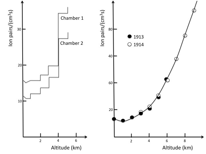 1909년, 테오도르 울프는 에펠탑 꼭대기에서 바닥보다 더 높은 수준의 방사선을 측정했다.[22] 1911년, 도메니코 파치니는 수중에서의 방사능 감소를 통해 이온화의 원인이 지구 방사능 외 다른 요인임을 밝혔다.[23]
