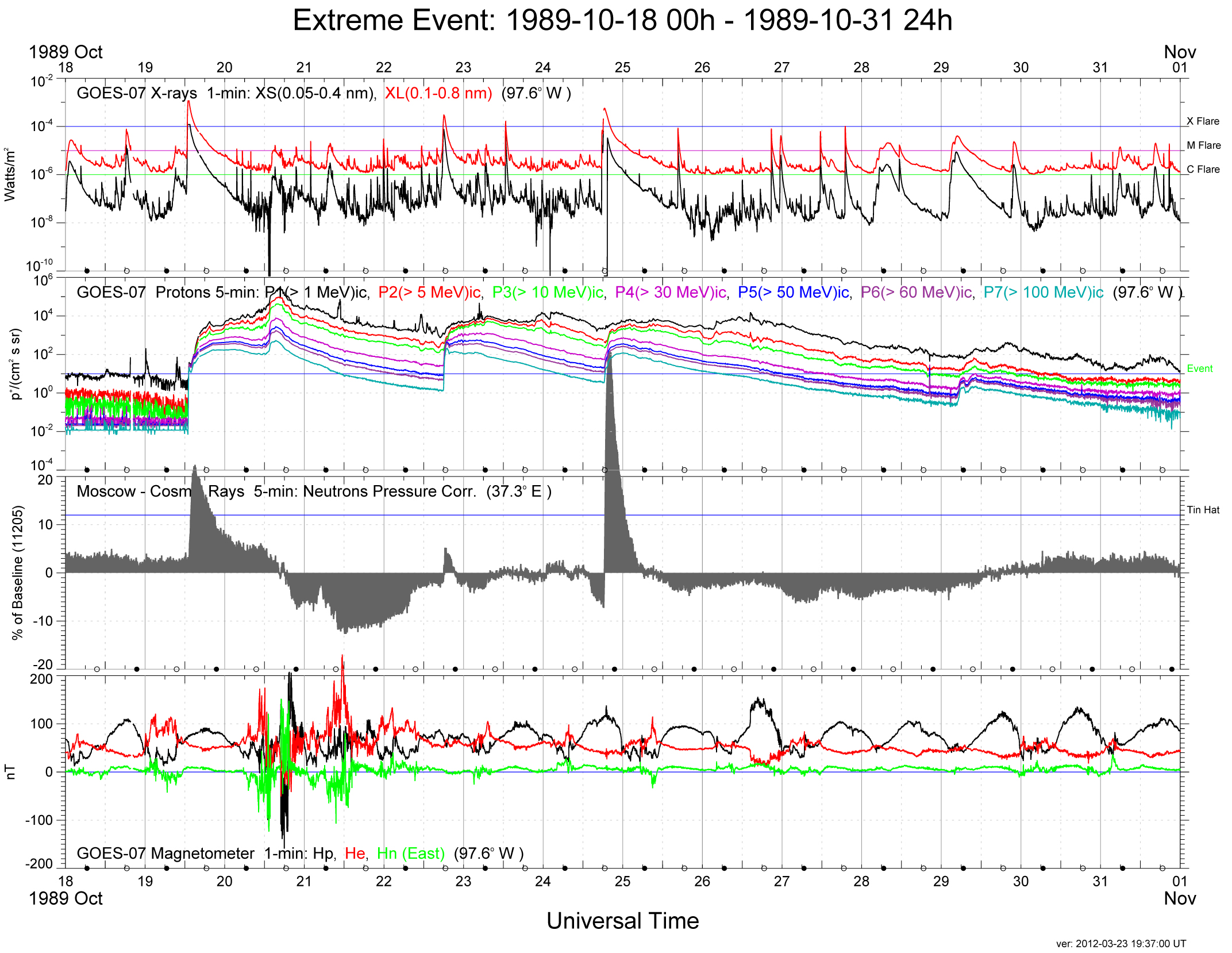 - 1989년 3월 지자기 폭풍은 여러 우주 기상 현상 (SEP, CME(코로나 질량 방출), 포르부쉬 감소, 지상 레벨 증가, 지자기 폭풍 등)을 포함했다.