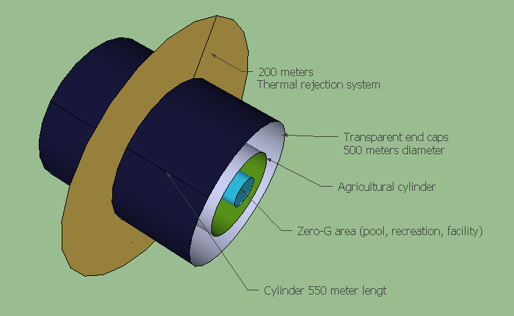 • 루이스 원:[36] 반경 250m의 원통으로, 회전하지 않는 방사선 차폐막이 있다. 이 차폐막은 미세 중력 산업 공간도 보호한다. 회전하는 부분은 길이가 450m이며 여러 개의 내부 원통이 있다. 그 중 일부는 농업에 사용된다.