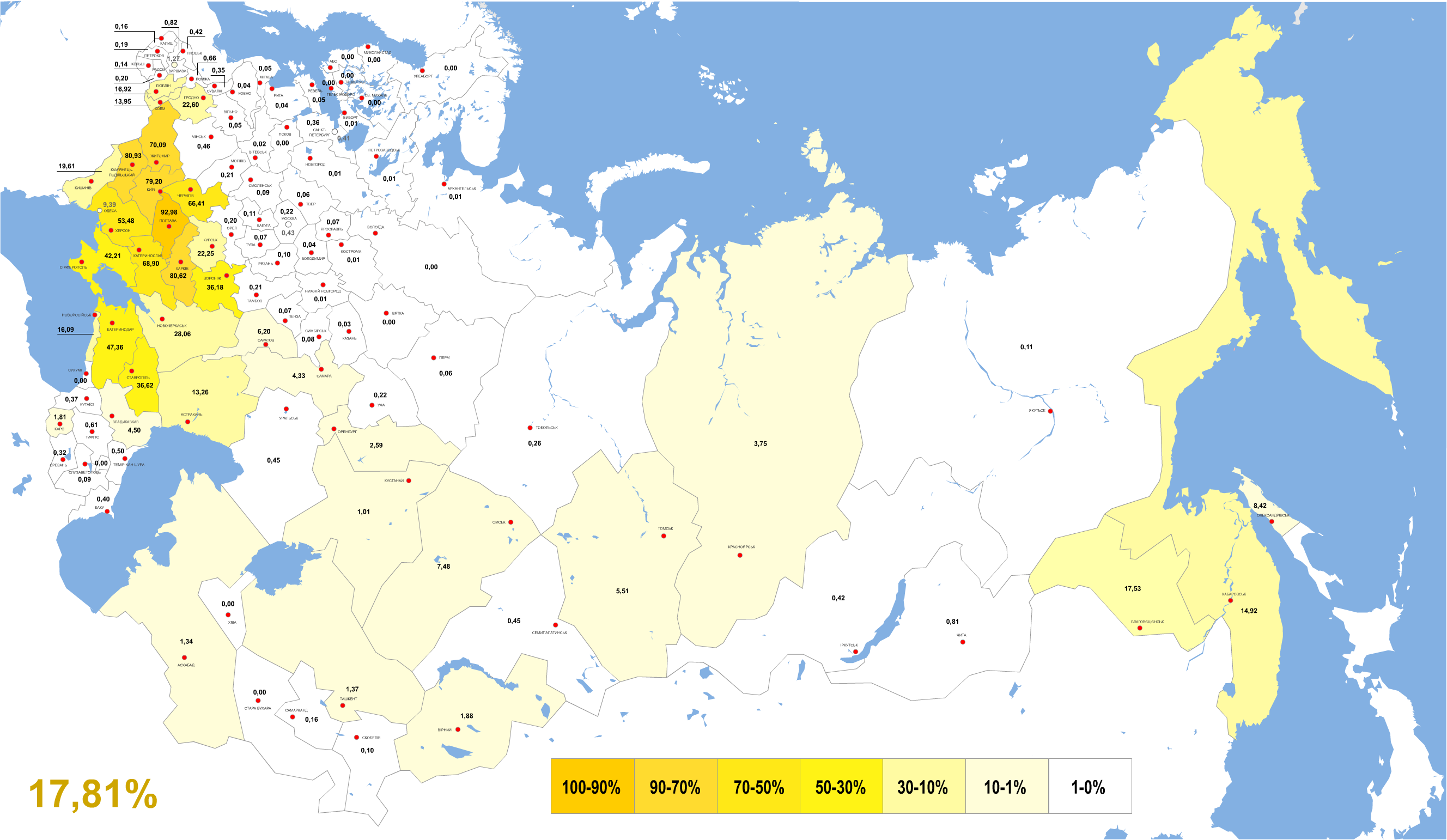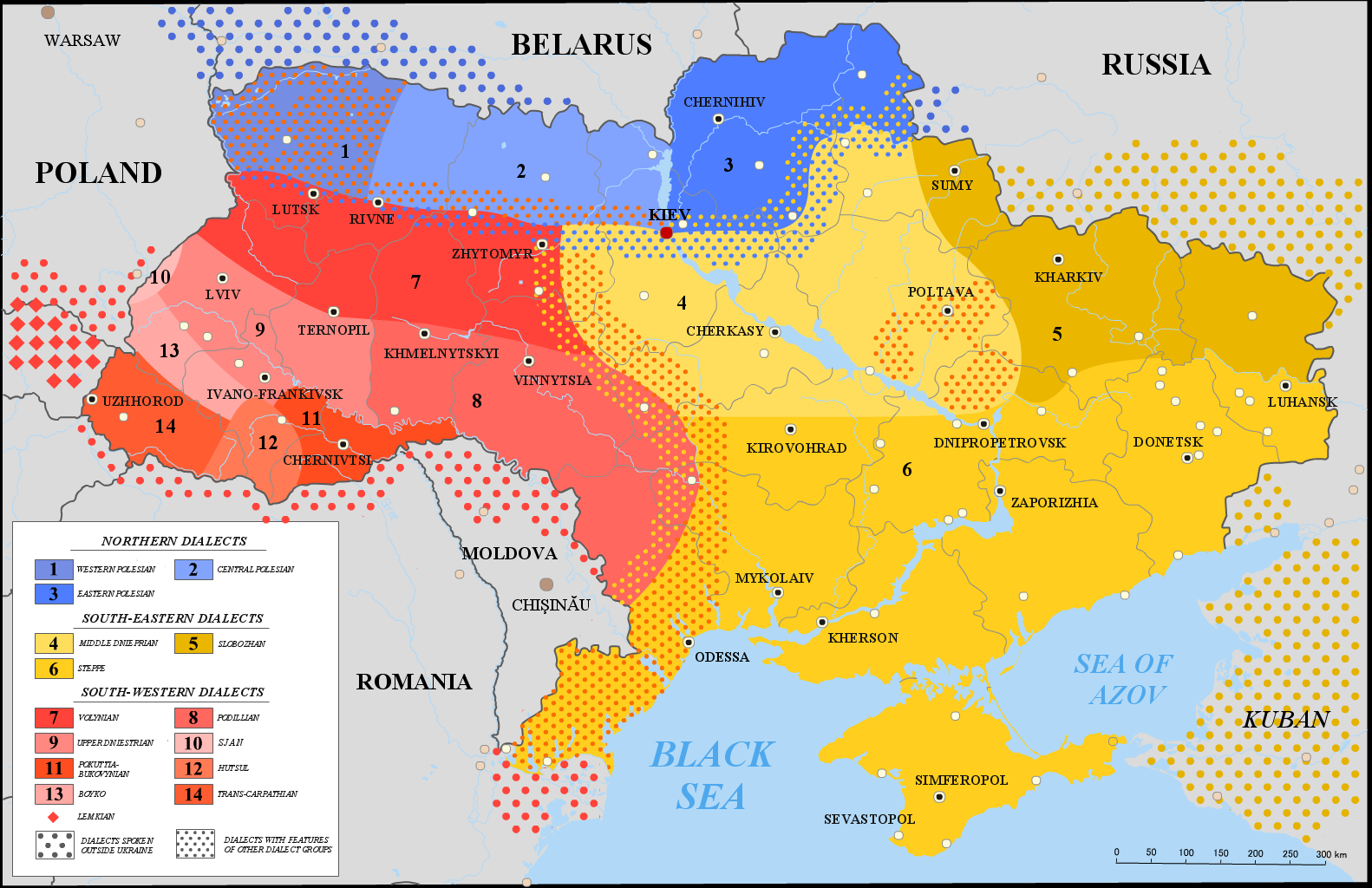 우크라이나어-폴란드어: 26–35 우크라이나어-불가리아어: 26–35 기타: 36–50