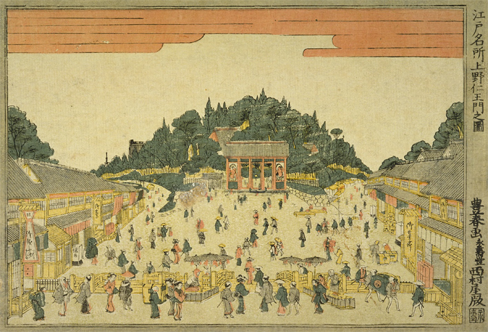도요하루는 우키에의 주제로서 풍경을 개척하는 데 기여했다.[6] 그의 초기 우키에 제작 연도는 정확히 알 수 없지만, 1772년 이전에 제작된 것으로 추정된다. 그 해 메이와 대화재로 인해 도요하루의 ''에도 명승도: 우에노 니오몬''의 주제인 우에노의 니오몬 문이 파괴되었기 때문이다.[7]