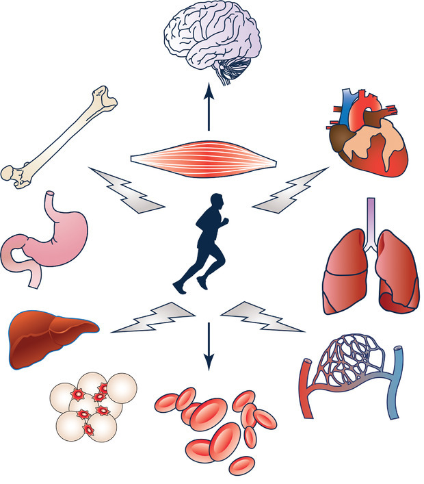 신체 운동이 중추신경계에 미치는 영향은 BDNF, IGF-1, VEGF 등 특정 신경 영양 인자 호르몬이 근육에 의해 혈액으로 방출되어 매개될 수 있다.[85][86][87]신체 훈련은 해마의 공간 인식 능력을 개발하고, 뇌 시냅스의 유연성과 뉴런의 생성 능력을 강화함으로써 뇌의 인지 능력을 높인다고 여겨진다. 또한 몸을 움직이는 것은 다양한 뇌세포의 질병으로부터 뇌를 방어하는 데 기여하며, 치매 증상이 진행될 위험을 줄일 수 있다.
