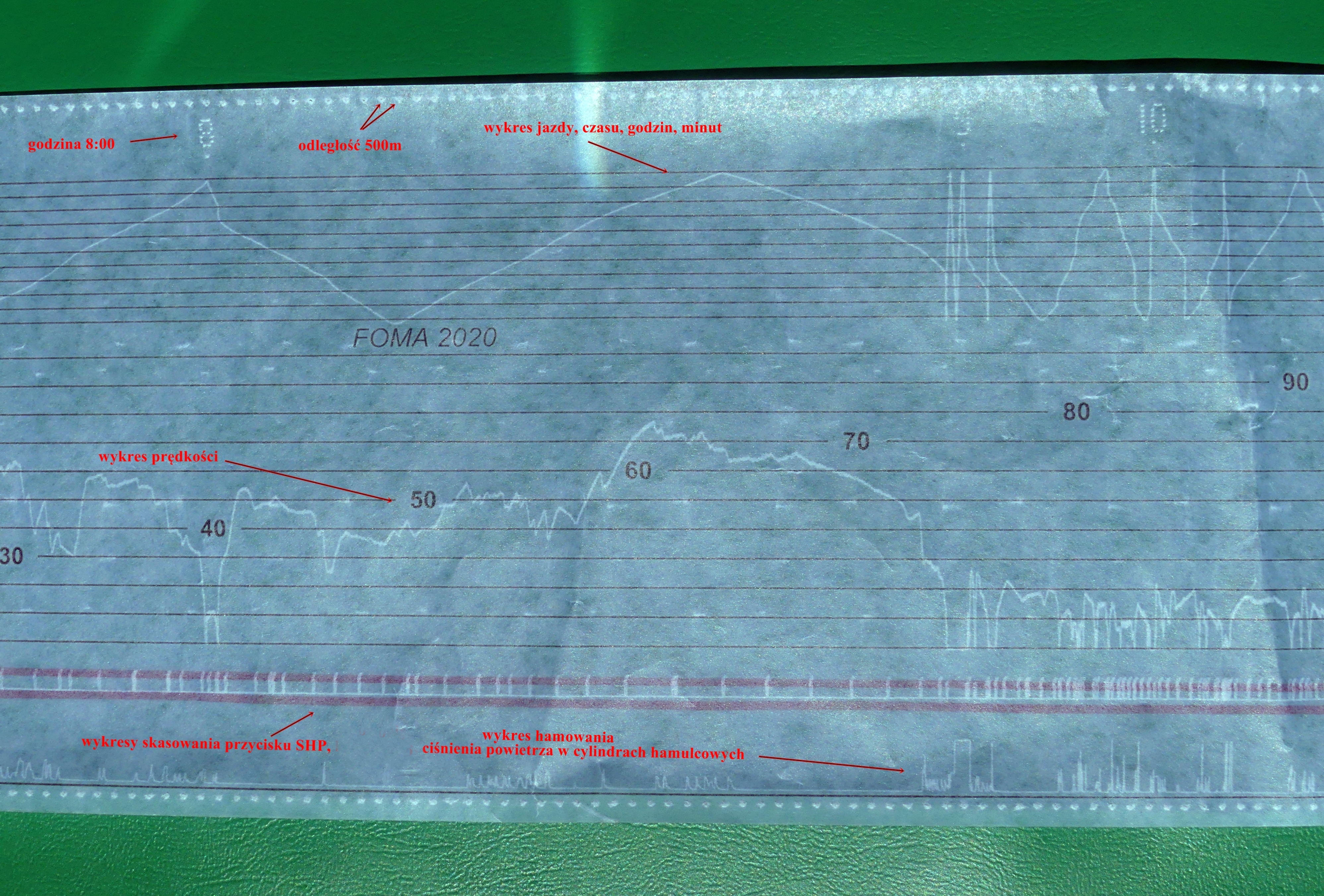 가장 바깥쪽 가장자리에 가장 가까운 기록은 '''속도 기록'''이다. 디스크는 속도 눈금으로 미리 인쇄되어 있으며 스타일러스는 주어진 시간에 차량의 속도에 해당하는 표시를 생성한다. 속도가 정확하게 기록되려면 차트의 최대 속도(Vmax) 사양이 타코그래프 헤드의 사양과 일치하는 것이 중요하다. 고속 기록은 거리 기록 내에서 간격이 좁은 지그재그 패턴과 상관관계가 있을 것으로 예상할 수 있다.