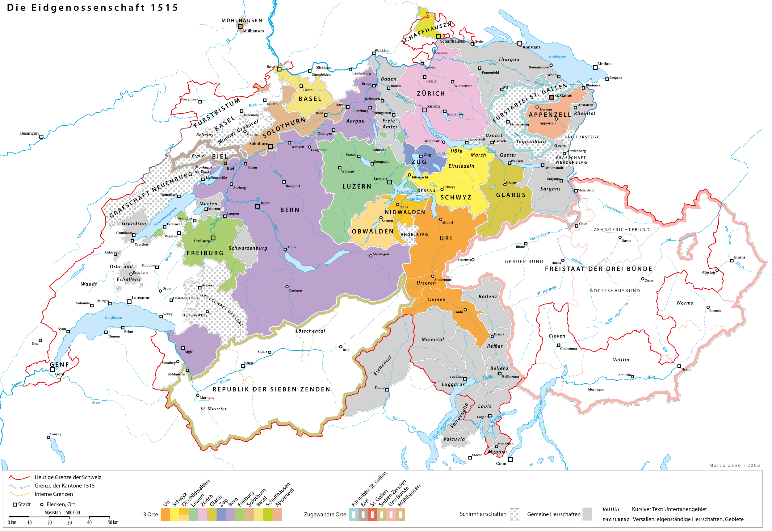 당시 스위스 연방은 13개의 주와 제휴 지역, 공동 영지로 구성되어 있었고, 각 주는 내정과 외교에서 상당한 독립성을 가지고 있었다. 이러한 상황은 종교 개혁 시기에 각 주가 서로 다른 종파로 나뉘면서 갈등의 원인이 되기도 했다.[12]