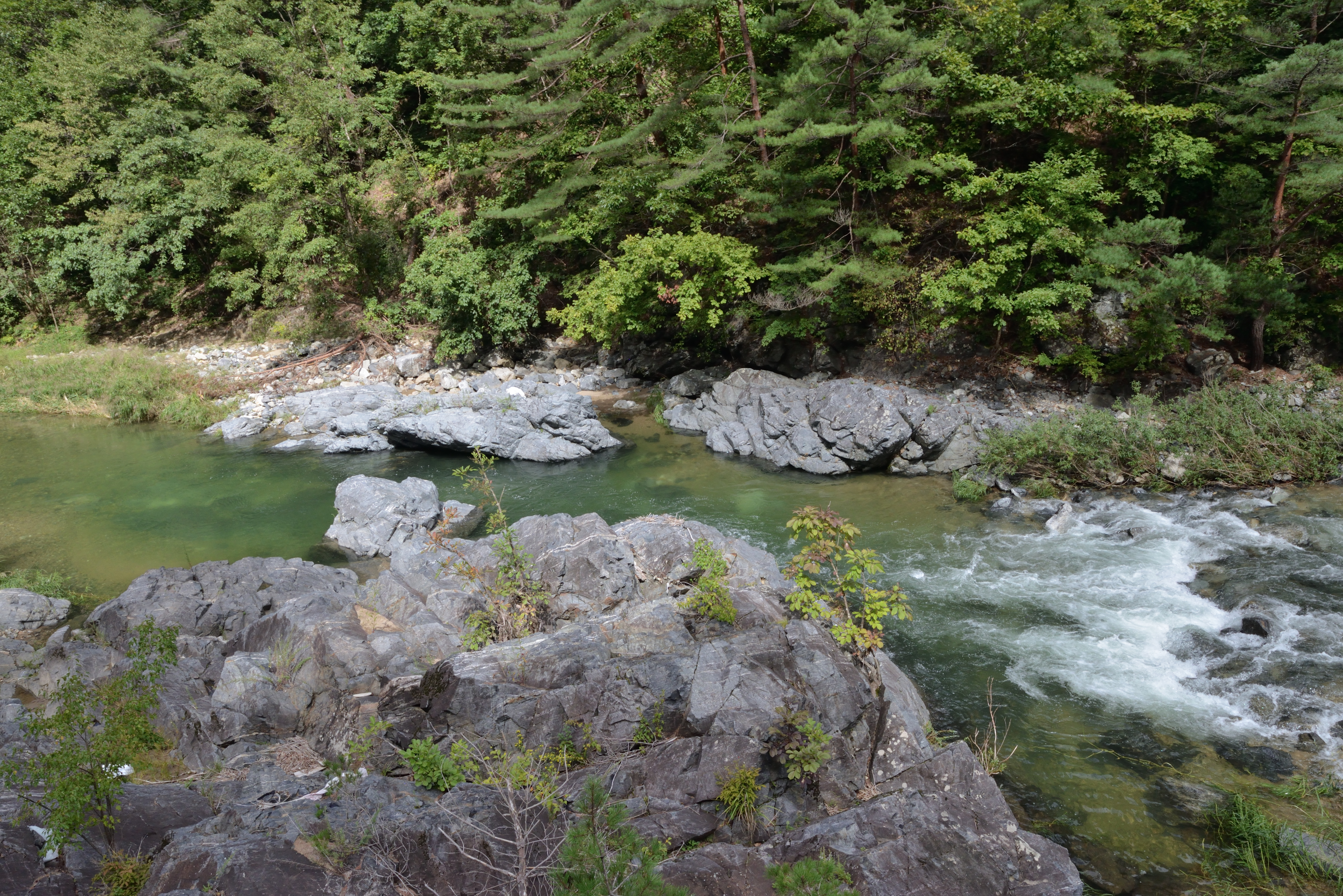 - 남대천의 지류를 따라 북서방향의 하당단층이 발달하고 있으며, 북면 하당1리의 중평교, 중석교, 상당리 부근에 단층과 산성암맥 노두가 노출되어 있다. 중평교에서도 약 10 m 폭의 단층 파쇄대를 갖는 단층이 발달하며, 이보다 북쪽 연장부인 중석교에서는 주향 북동 40°/경사 남동 70°을 보이고 약 5 m 폭의 단층파쇄대가 발달하고 있다. 상당리에서도 북서주향을 보이는 산성암맥과 단층이 노출되어 있다.[1]