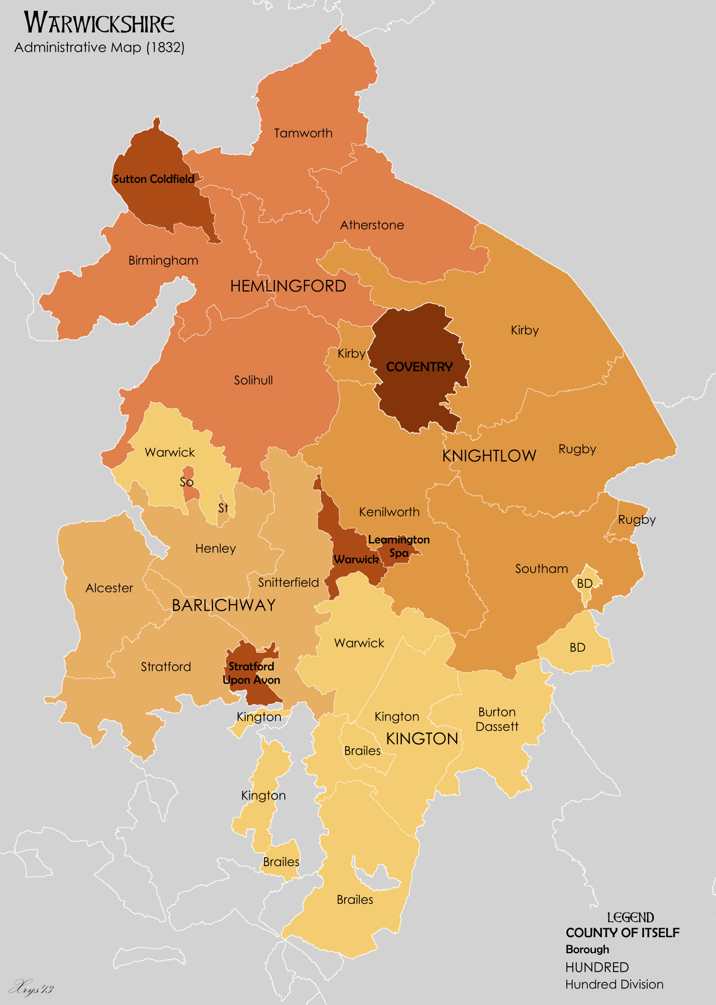 1844년 | 1844년의 군(분리 지역)법(Counties (Detached Parts) Act)에 따라 1개 읍, 2개 교구가 워릭셔주에 편입. |