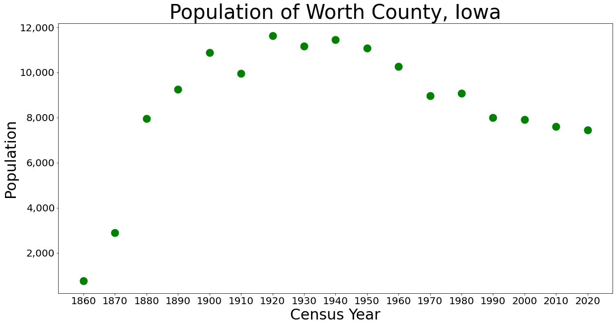 워스군의 인구는 1940년대에 최고치를 기록한 이후 점진적으로 감소하는 추세를 보이고 있다. 각 시기별 상세한 인구 통계는 아래 하위 섹션에서 확인할 수 있다.