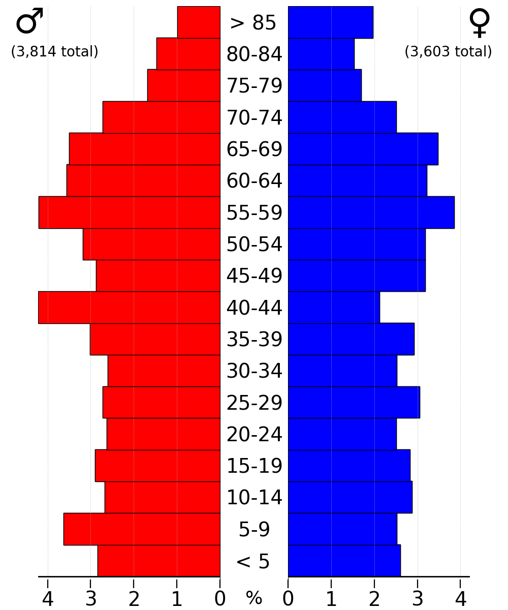 중앙 연령은 41세였다. 여성 100명당 남성은 98.50명이었으며, 18세 이상 여성 100명당 남성은 95.20명이었다.