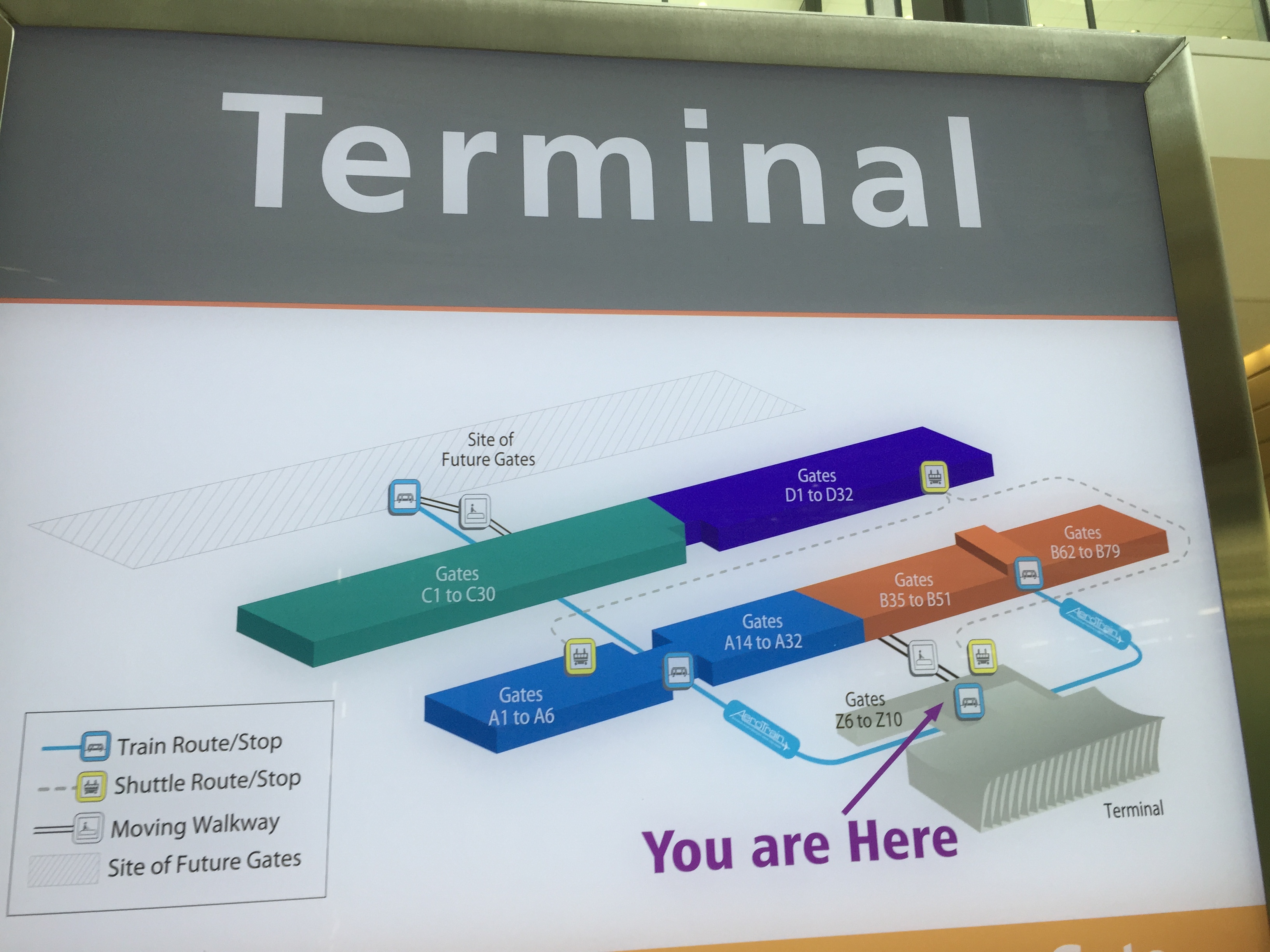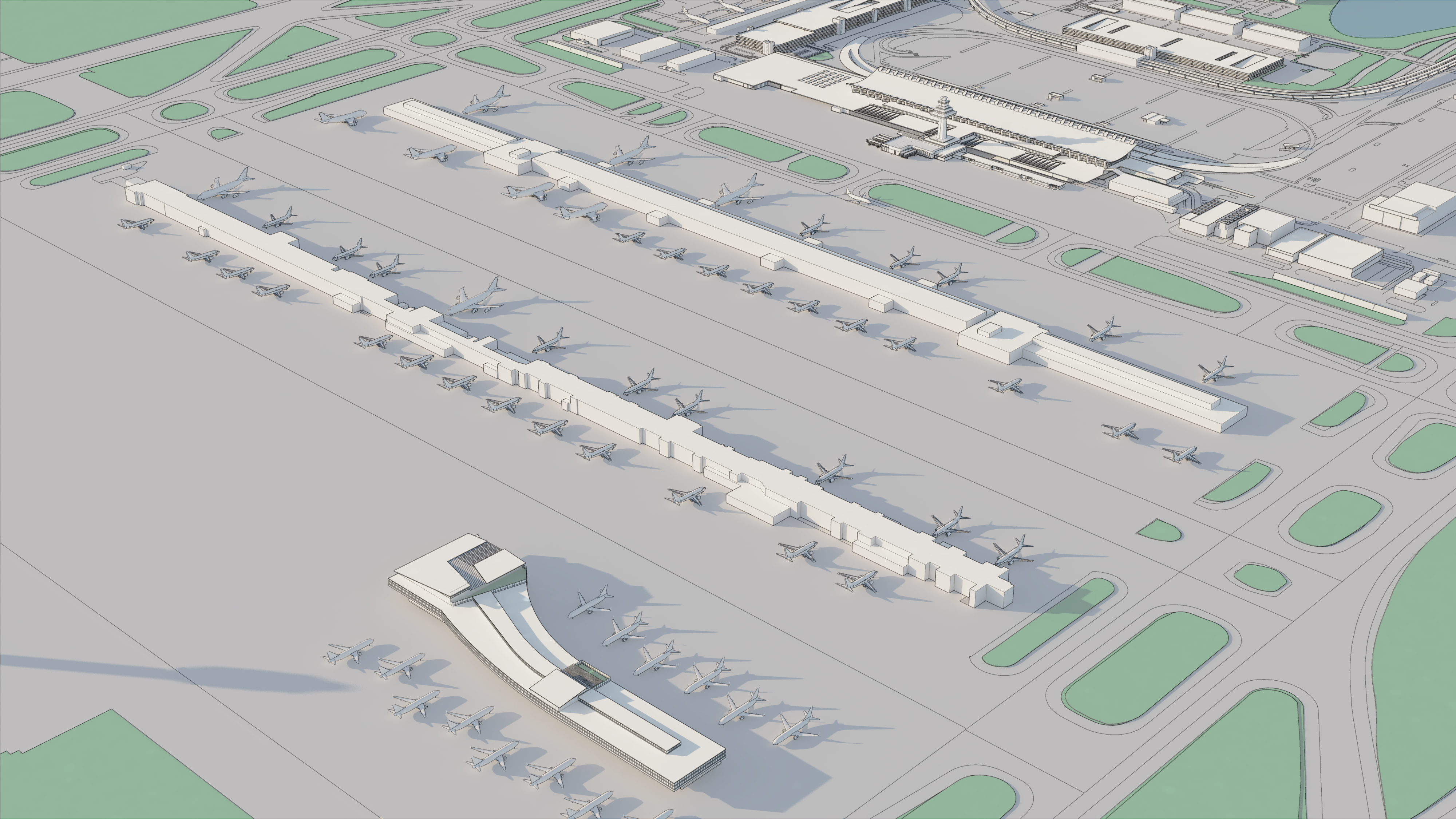 모든 항공사는 특정 급행 항공편을 제외하고 2개의 선형 위성 터미널에서 운항한다. 각 터미널은 2개의 연결 통로로 나뉘며, 북쪽 터미널은 A, B 연결 통로를, 남쪽 터미널은 C, D 연결 통로를 포함한다.[81]