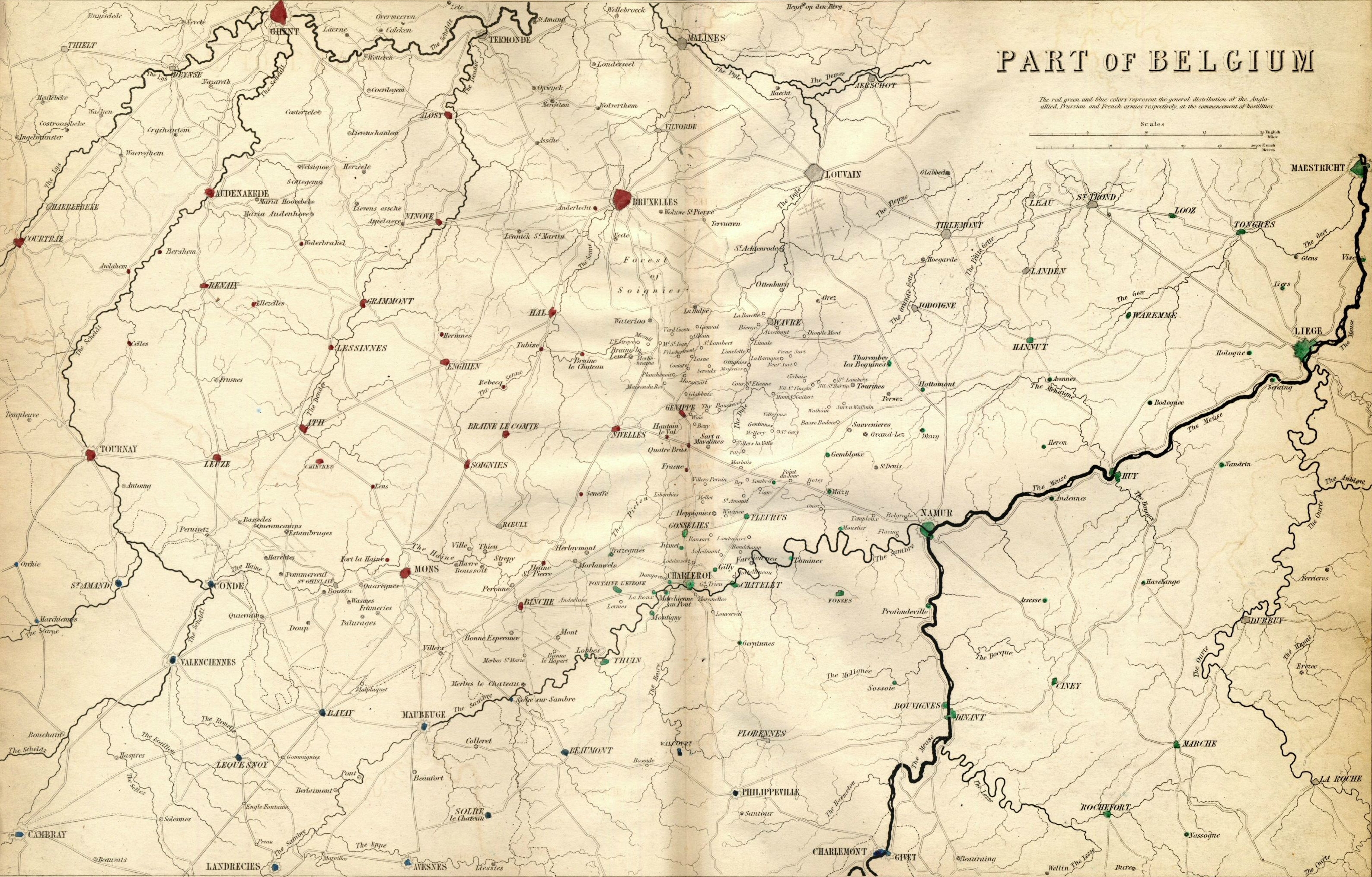 1815년 6월 15일 전투 개시 직전 군대의 초기 배치 상황을 색상으로 표시한 벨기에 일부 지도: 영국-연합군은 적색, 프로이센은 녹색, 프랑스는 청색