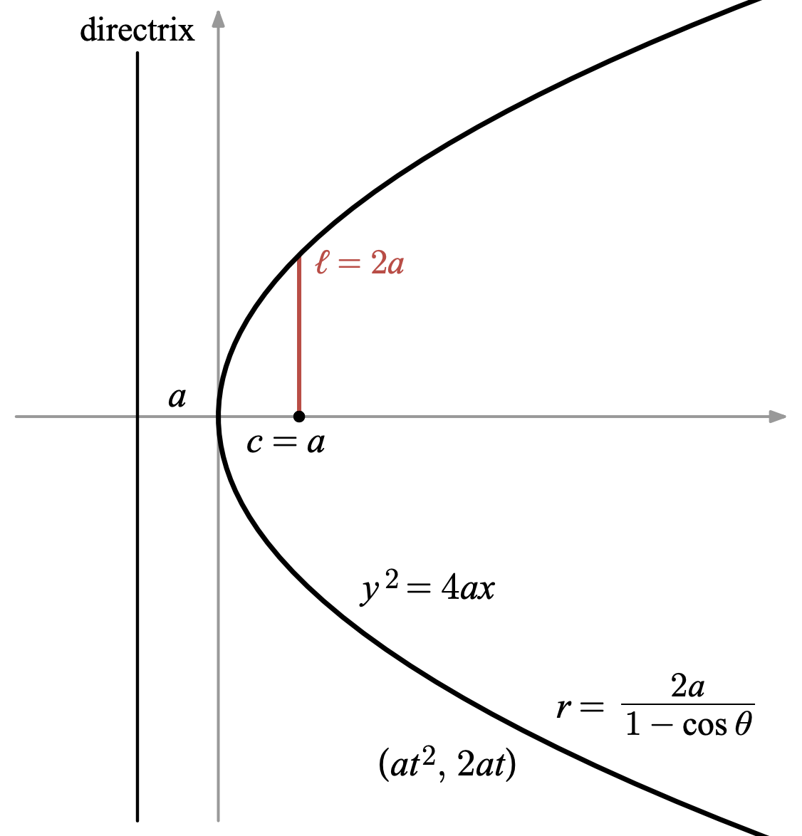 이라는 극방정식으로 나타낼 수 있다. 은 선분 의 길이, 는 선분 이 축과 이루는 각도이다. 이 식은 와 이라는 두 매개변수를 통해 타원, 포물선, 쌍곡선의 3종류 원뿔곡선을 통일적으로 나타낸다고 할 수 있다.