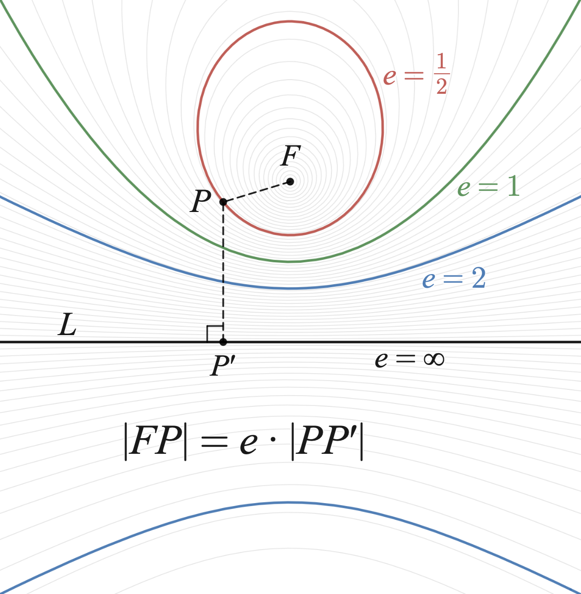 원뿔곡선은 한 점(초점)으로부터의 거리와 한 직선(준선)으로부터의 거리의 비(이심률)가 일정한 점들의 자취로 정의할 수 있다.