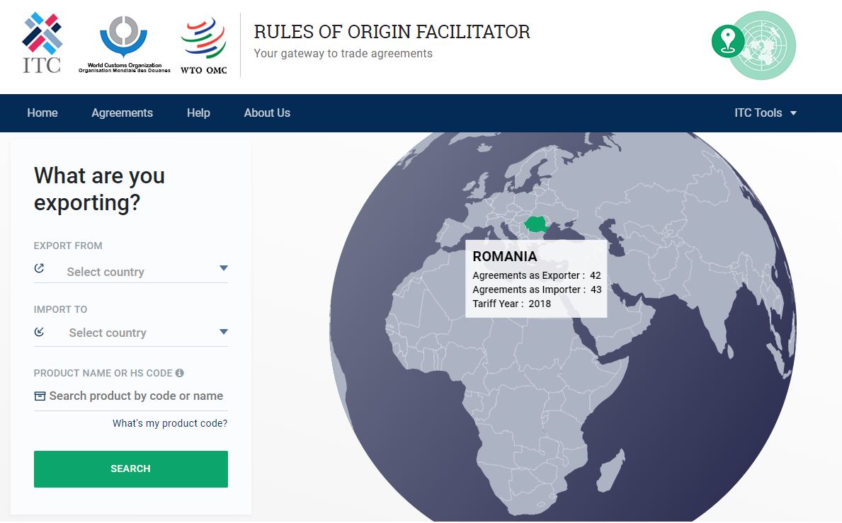 국제무역센터(ITC)는 세계관세기구(WCO)와 세계무역기구(WTO)와의 공동 프로젝트로 원산지 규정 지원 도구(Rules of Origin Facilitator)를 제공하여,[30] 기업들이 무역 협정에 따른 낮은 관세율을 활용할 수 있도록 지원한다. 이 도구는 190개국 이상이 적용하는 230개 이상의 자유무역협정(FTA) 데이터를 포함하고 있다.