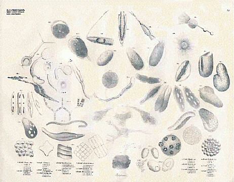 - '''식물성 편모충''': 광합성 능력을 가진 편모충류를 의미한다. 여기에는 녹조류, 와편모조류, 유글레나류, 황금색소류 등이 포함되었다. 이들은 조류로서도 분류학적 위치를 부여받았기 때문에, 플랑크톤 도감 등에서는 동물 부분과 식물 부분 양쪽에 나타나는 경우도 있었다. 당시에도 이들은 식물학적으로는 서로 다른 문에 속해 있었다.