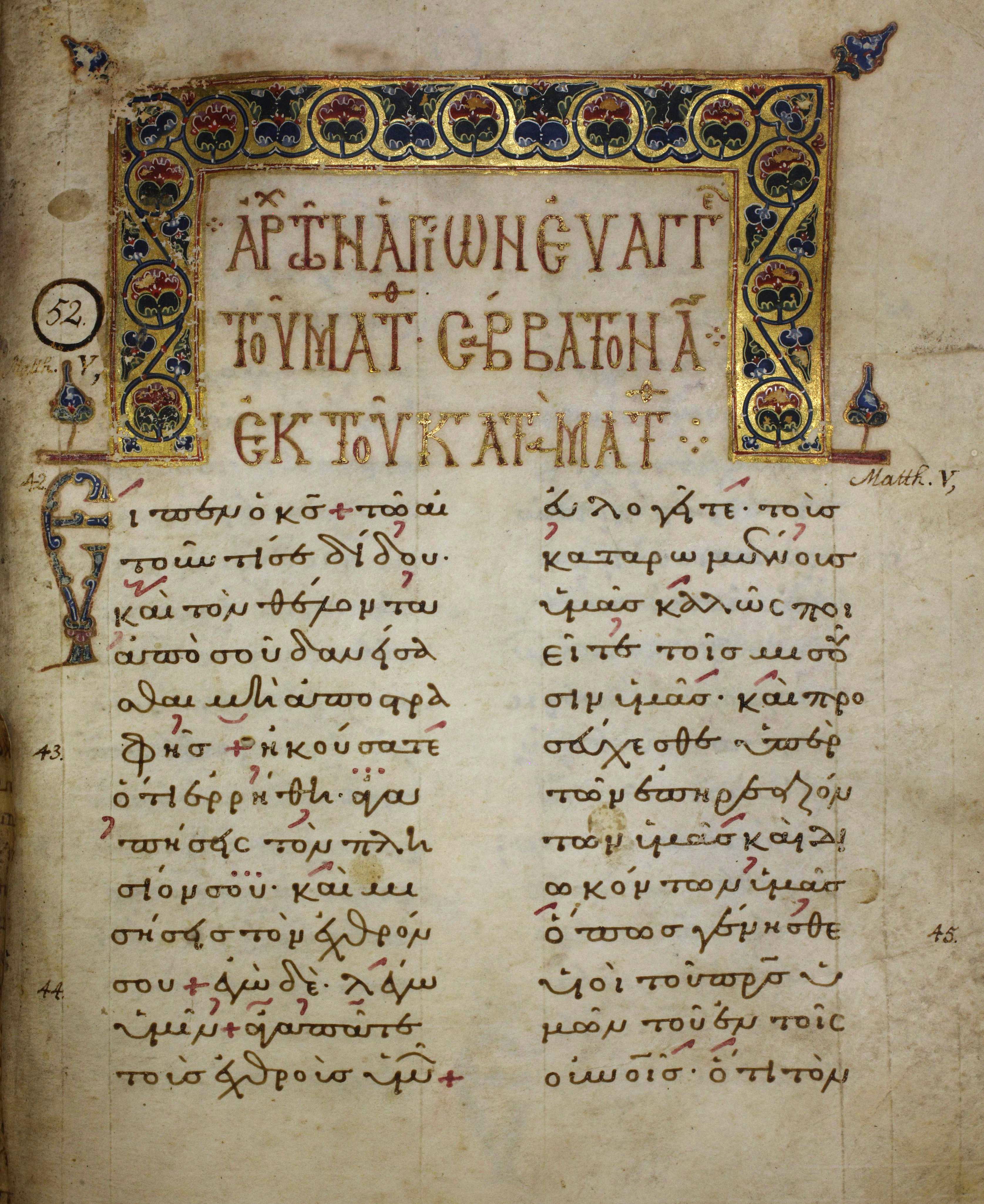 많은 현대 번역본( 알렉산드리아 사본을 따름)은 이 구절의 일부를 생략한다. 예를 들어, 신 국제 버전은 "그러나 내가 너희에게 말한다. 너희의 원수를 사랑하고 너희를 박해하는 자를 위해 기도하라"라고 번역한다.[4]