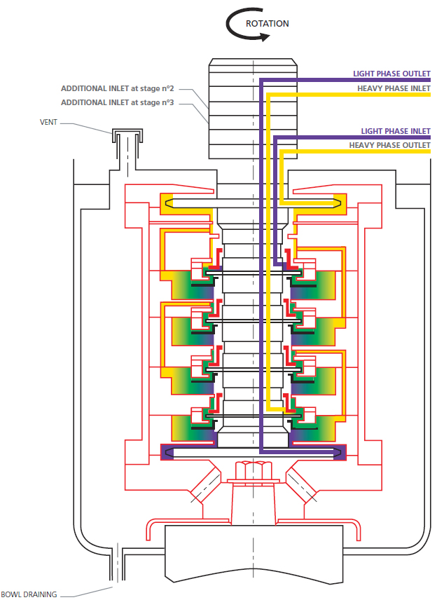 다단 원심 추출기는 여러 개의 기계적 단계(stage)로 구성된 로터를 사용한다. 추출하려는 하나 이상의 용질을 포함하는 공급 용액(그림 3의 단면도에서 무거운 상)과, 이와 밀도가 다르며 서로 섞이지 않는(혼화성) 용매(그림 3의 단면도에서 가벼운 상)가 로터 내부에서 서로 반대 방향으로 흐른다.