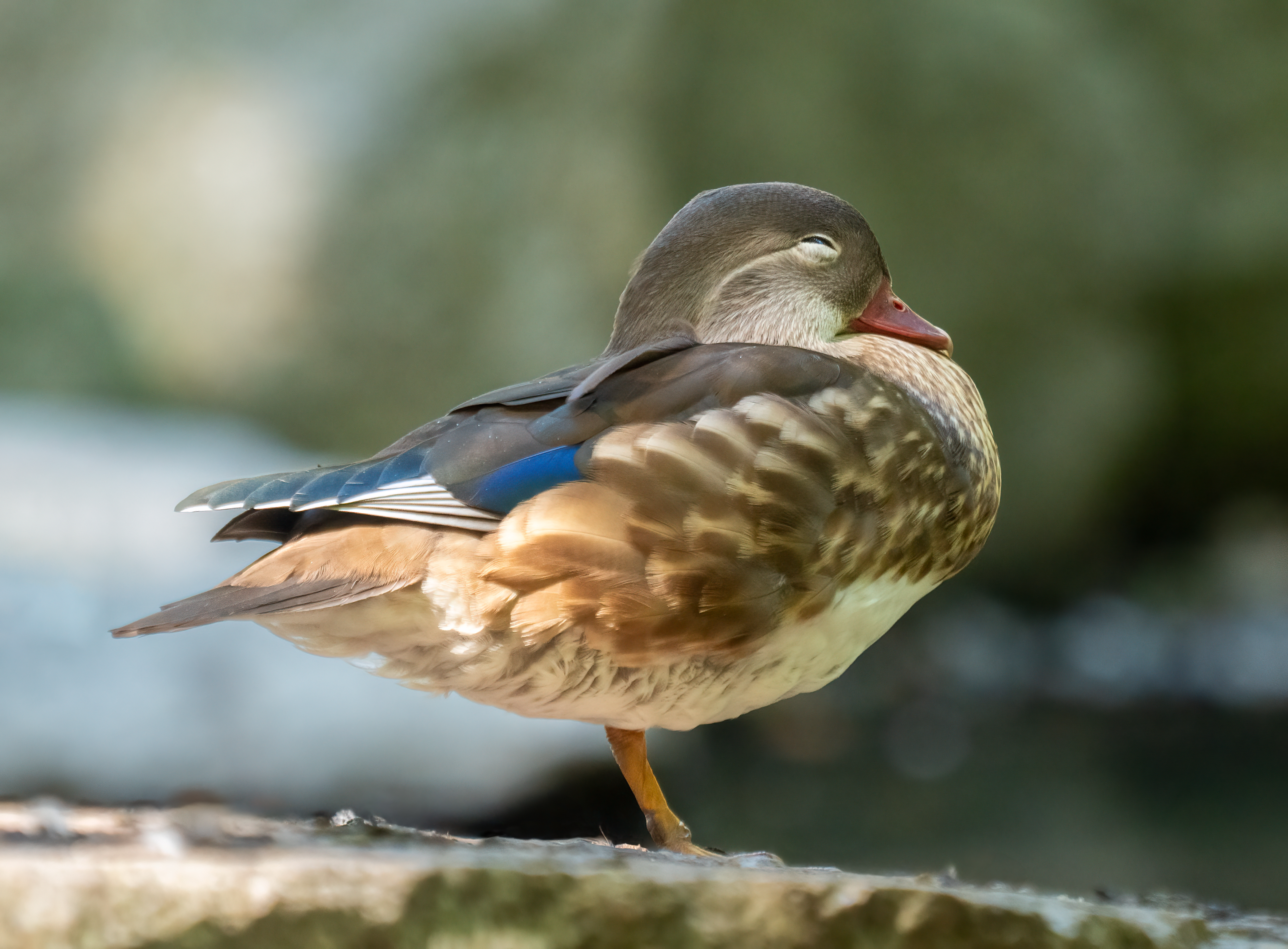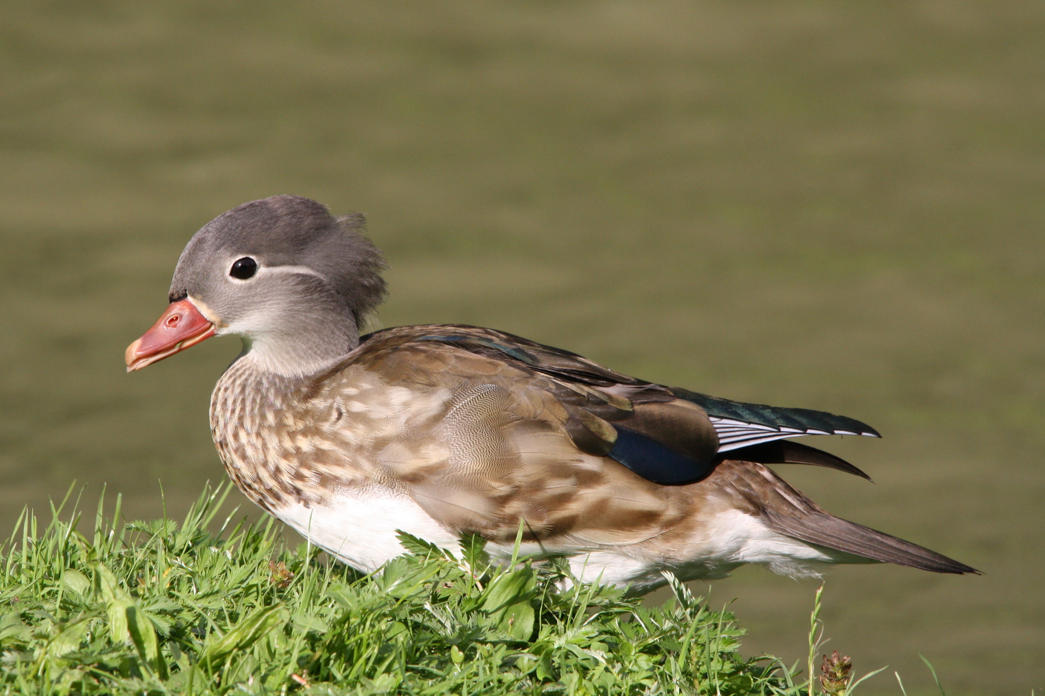 번식이 끝나면 수컷은 아름다운 갓깃이나 뺨의 장식깃이 떨어지며, 온몸이 암컷과 비슷한 에클립스깃색이 된다. 다만 이 시기에도 부리가 암컷과 다른 붉은색이다. 암컷은 전반적으로 회갈색이고, 가슴과 옆구리에는 굵은 회색 얼룩이 줄지어 있다.많은 다른 오리 종들과 마찬가지로, 수컷은 짝짓기 시즌 후 깃갈이를 거쳐 번식깃을 벗는다. 번식깃을 벗은 수컷은 암컷과 비슷하게 보이지만, 밝은 노란색, 주황색 또는 붉은 부리, 댕기가 없고, 눈 주위 줄무늬가 덜 뚜렷한 점으로 구별할 수 있다.