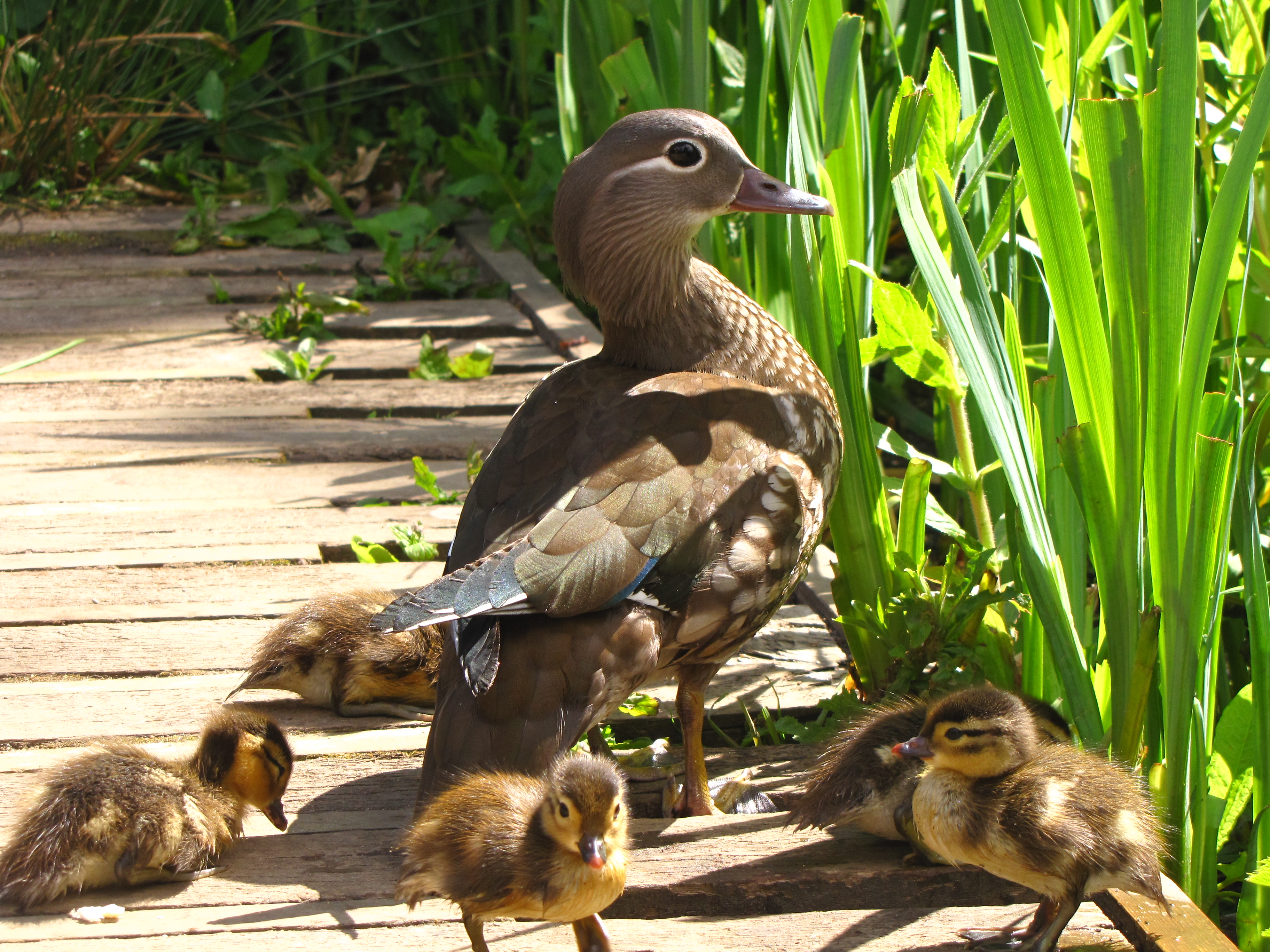 원앙은 몸길이 40cm~50cm, 몸무게 500g가량으로 작은 오리류와 비슷하며 다리가 약간 길다. 흰뺨검둥오리는 다른 물오리류에 비해 작은 종으로, 물닭보다 키가 작고 몸집도 작으며, 미국 원앙보다 약간 작다. 알은 길이 5.3cm, 폭 3.7cm이다.[26] 원앙 새끼는 외형적으로 미국 원앙 새끼와 거의 동일하며, 청둥오리 새끼와 매우 유사하다. 원앙 새끼는 원앙 새끼(및 미국 원앙 새끼)의 눈 주위 줄무늬가 눈에서 멈추는 반면, 청둥오리 새끼의 눈 주위 줄무늬는 부리까지 이어지는 점으로 청둥오리 새끼와 구별할 수 있다.