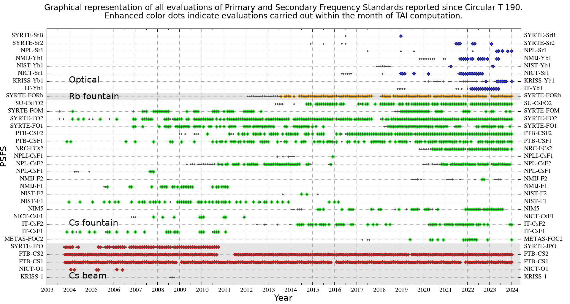 국제 원자시(TAI)는 국제도량형국(BIPM)에서 관리하며, 주요 및 보조 주파수 표준의 성능을 평가하고 보고한다. SI 단위계에서 1초는 세슘-133 원자의 초미세 전이 주파수를 기준으로 정의되므로, 세슘 표준은 1차 시간 및 주파수 표준으로 간주된다.