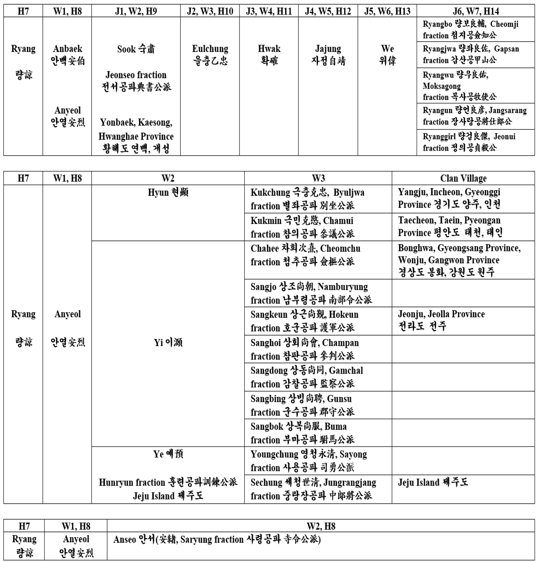 ○정(靖) 순(純)○ | 량(良)○ 응(應)○ ○용(龍) ○수(秀) ○종(宗) | 이(以)○ | 상(尙)○ | ○국(國) | 경(慶)○ | ○화(和) | ○환(煥) | 규(圭)○ | 석(錫)○ | 영(永)○ 승(承)○ | ○식(植) ○근(根) ○상(相) |